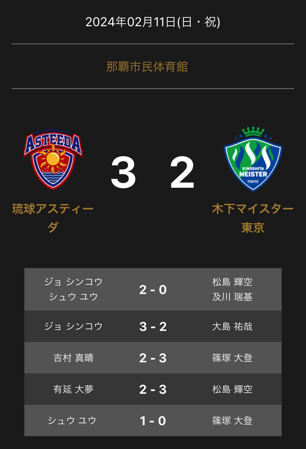 ノジマTリーグ 2023-2024シーズン 公式戦 2月11日開催 「琉球アスティーダvs 木下マイスター東京」の試合は3-2で琉球アスティーダが勝利しました。