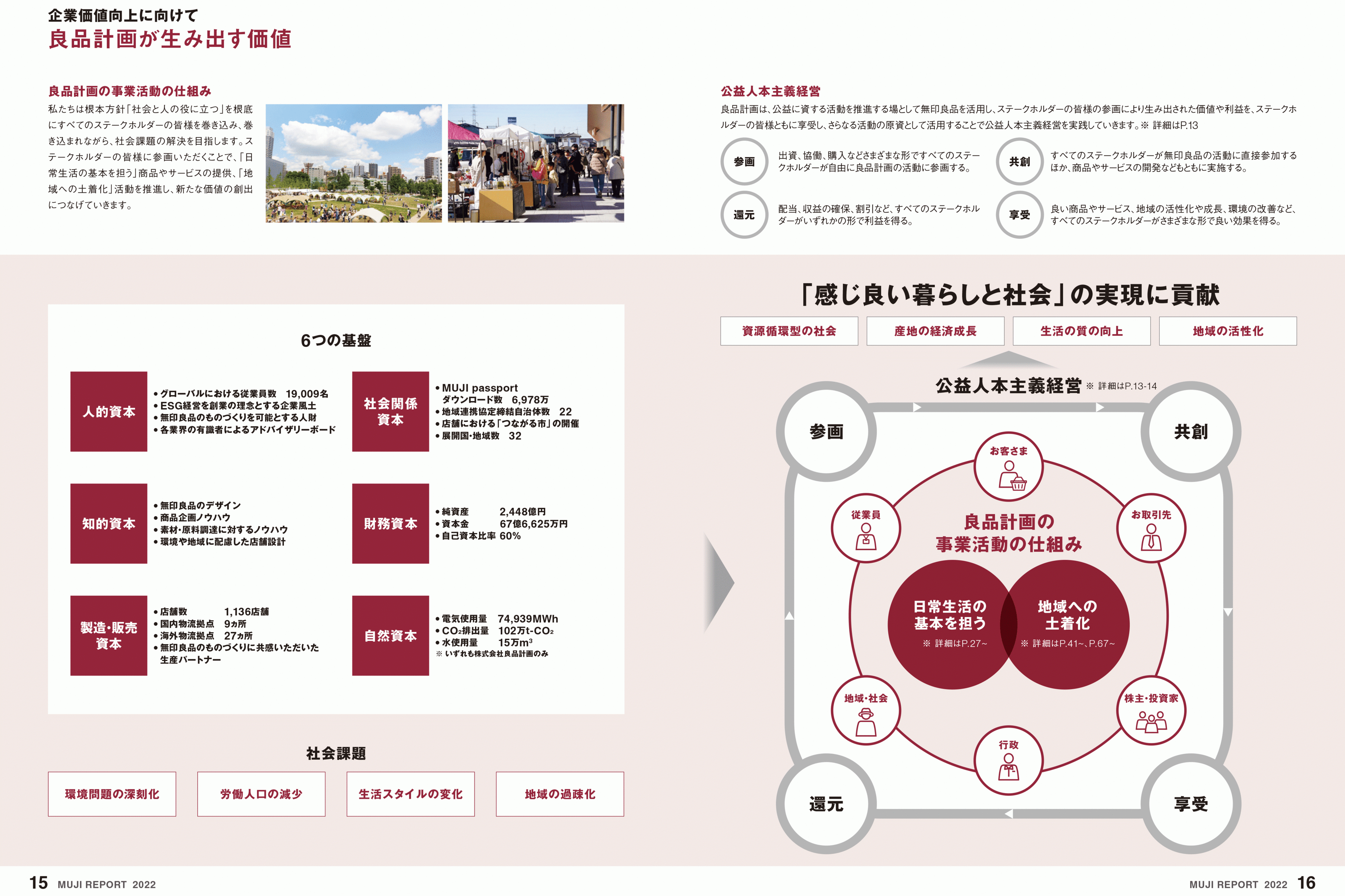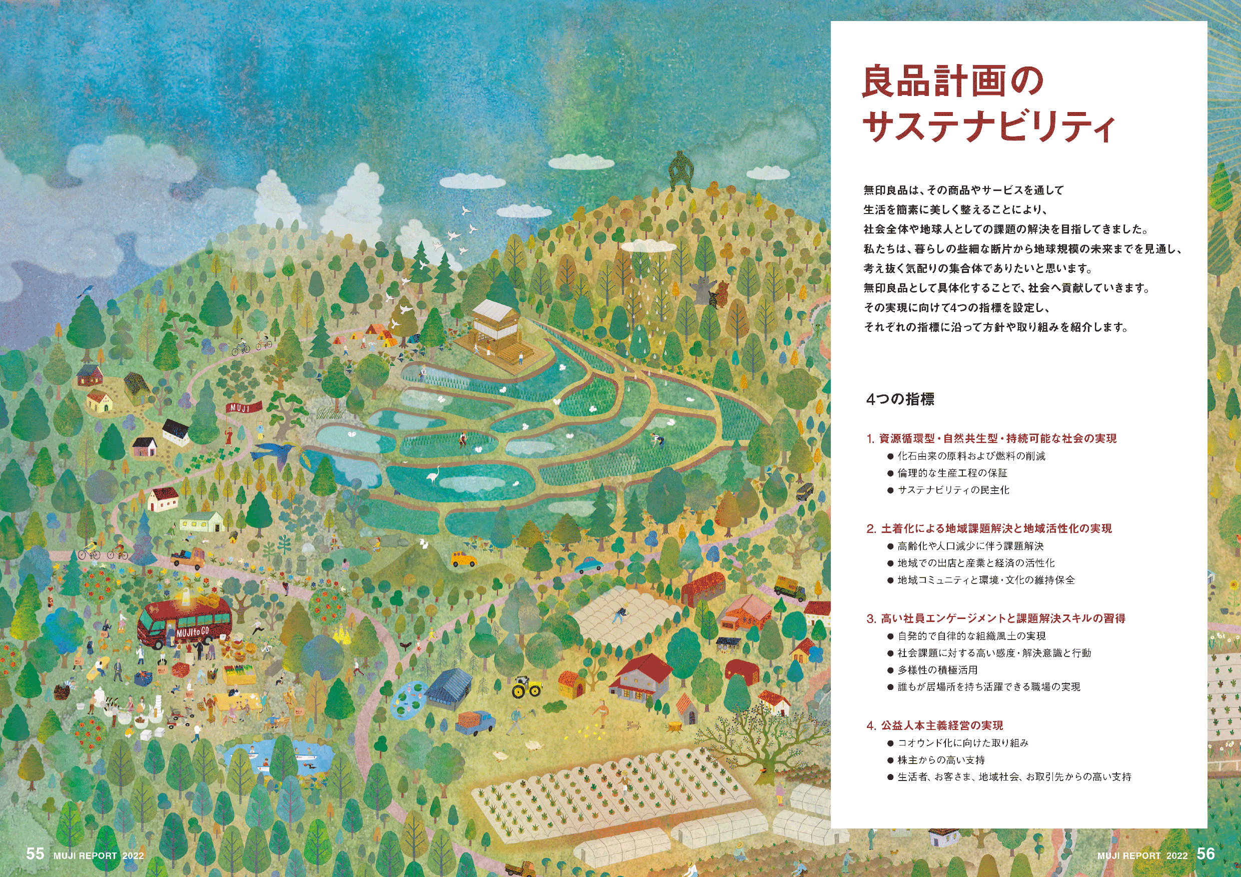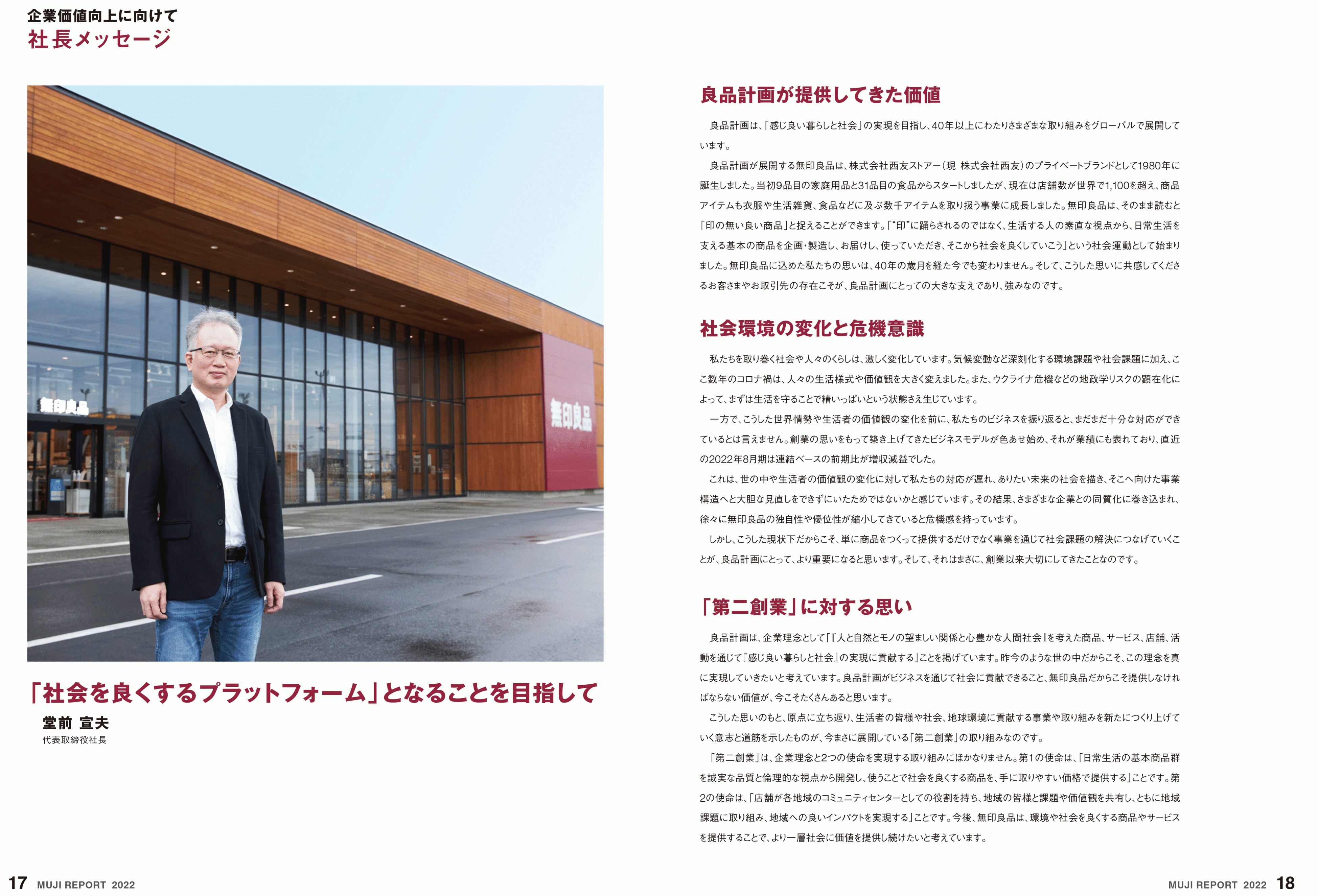 無印良品を展開する株式会社良品計画(東京都豊島区/代表取締役社長 堂前 宣夫)は、本日、良品計画グループ統合報告書「MUJI REPORT 2022」(全100ページ)を発行し、WEBサイト上に公開しました。