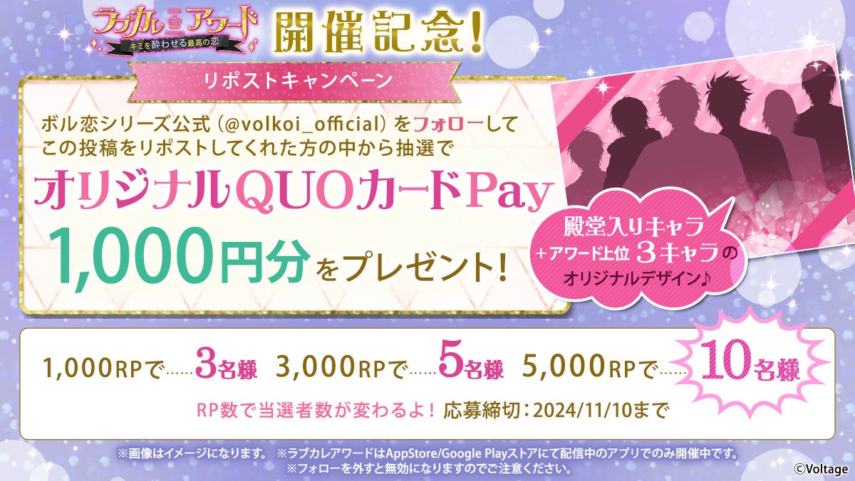 本イベントは、対象のアプリをプレイすると投票券が手に入り、ボルテージの無料会員ポイントサイト「VOLTAGEパスポート」に連携の上で本イベントにエントリーすることで投票が可能となります。見事1位に輝くと「いつもよりちょっと大胆に♡激甘ストーリー 」を公開するほか、1~10位キャラクターのグッズ化など特典も多数ご用意しておりますので、この機会にぜひボルテージのイケメンキャラクターが集結する投票イベント「ラブカレアワード」をお楽しみください。