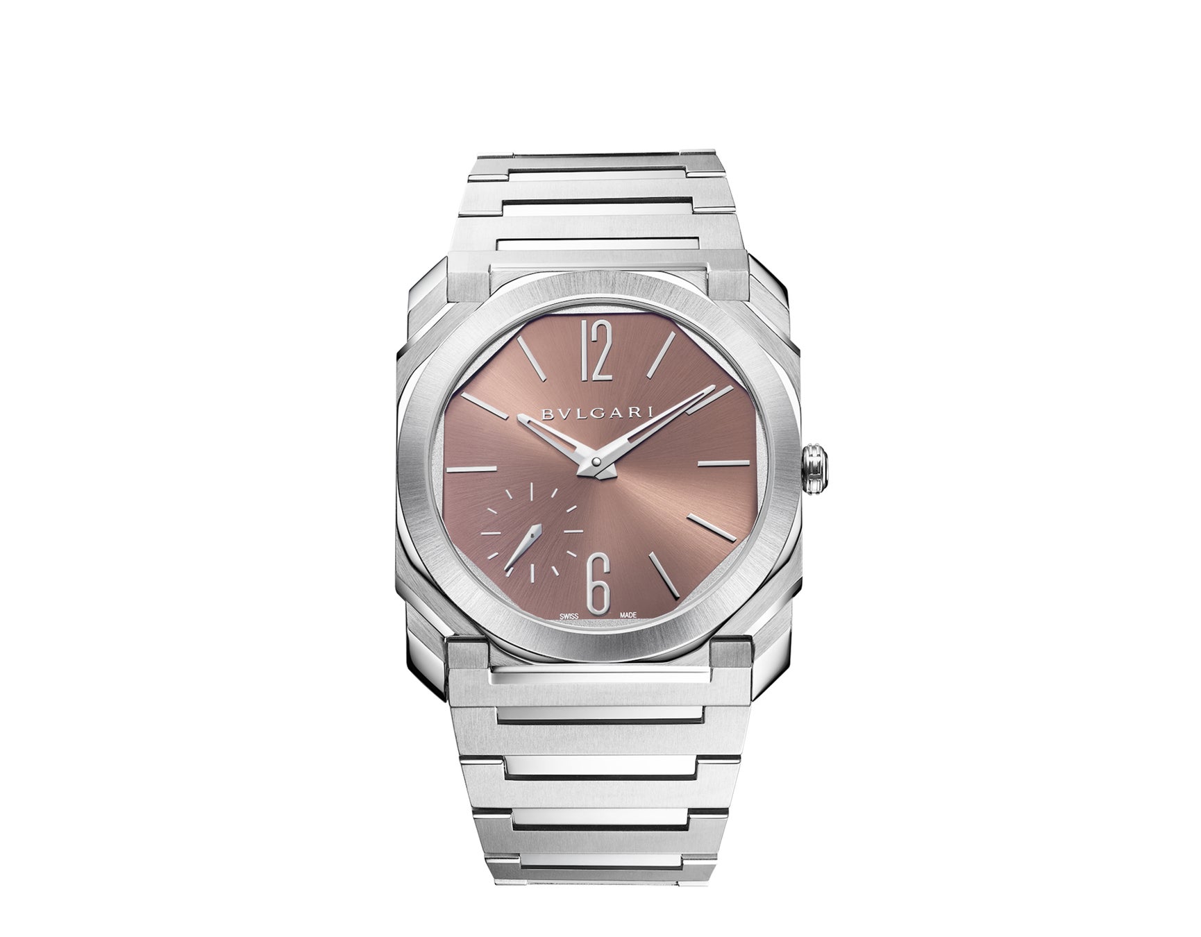 「オクト フィニッシモ タスカンコッパー」とともに、ブルガリは新たなクリエイティブの領域に踏み出しました。真のステイトメントピースであり、サーモンカラーのサンレイ仕上げのタスカンコッパーダイヤルは、熱望するブルガリ愛好家も多い希少なタイムピースです。ロジウムプレートの針とインデックスが、コッパーカラーのダイヤル上に繊細かつエレガントなコントラストを生み出しています。ケースとブレスレットは航空宇宙産業でも使用されているレベルの904Lステンレススティール製です。約60時間パワーリザーブのキャリバーBVL 138を搭載しています。