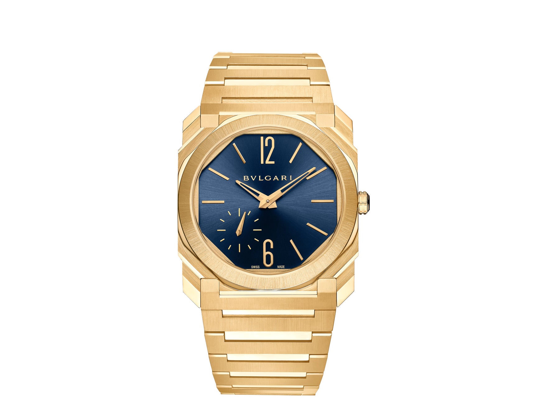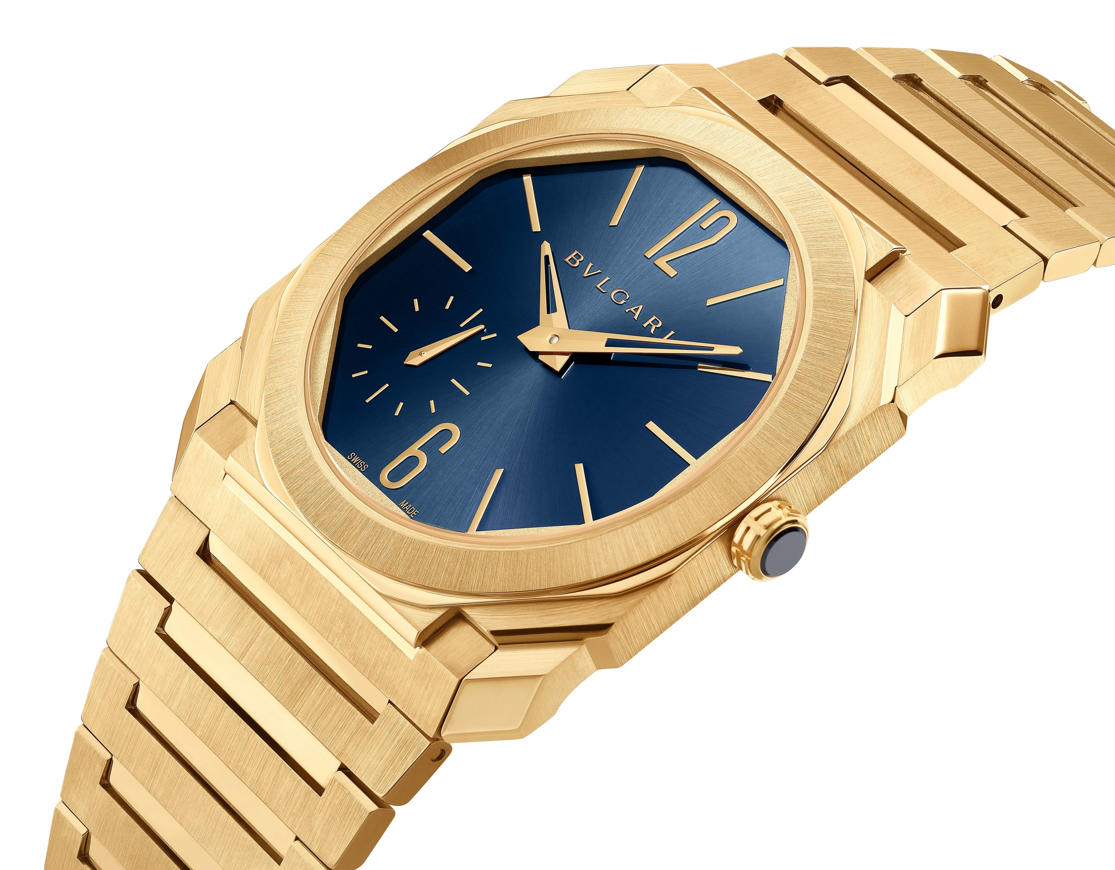 イエローゴールドと「オクト フィニッシモ」が融合し、永遠の美学が新たな光を放ちます。このプレシャスな素材は長い歴史の中で培われたゴールドについてのブルガリの熟練技術を反映しているだけでなく、ヴィンテージのラグジュアリーウォッチが持つ魅惑的な輝きを感じさせます。太陽のごとく輝くゴールドが「オクト フィニッシモ」の大胆なラインと、ローマにインスパイアされた幾何学的な形の上に降りそそぐ様々な光を引き立てます。多くのファセットを持つケースは建築的な角度で絶妙な仕上げが施され、トリプルブレードフォールディングクラスプが備えられたサテン仕上げのイエローゴールド製ブレスレットが抜群の着け心地を叶えています。サンレイ仕上げが施されたディープブルーのダイヤルがゴールドの魅力を引き立てます。ゴールドの針とインデックスがコントラストを生み、シックでスポーティなタイムピースにふさわしい抜群の視認性を実現しています。直径40mm厚さわずか6.4mmの薄さを誇るこの新作「オクト フィニッシモ」は、100m防水という卓越した防水性能とともにその多用性も魅力です。