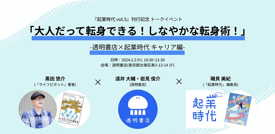 フリー株式会社(以下「freee」)が提供する起業・開業の専門雑誌『起業時代 vol.5』の発売を記念し、トークイベント「大人だって転身できる!しなやかな転身術!」を開催いたします。