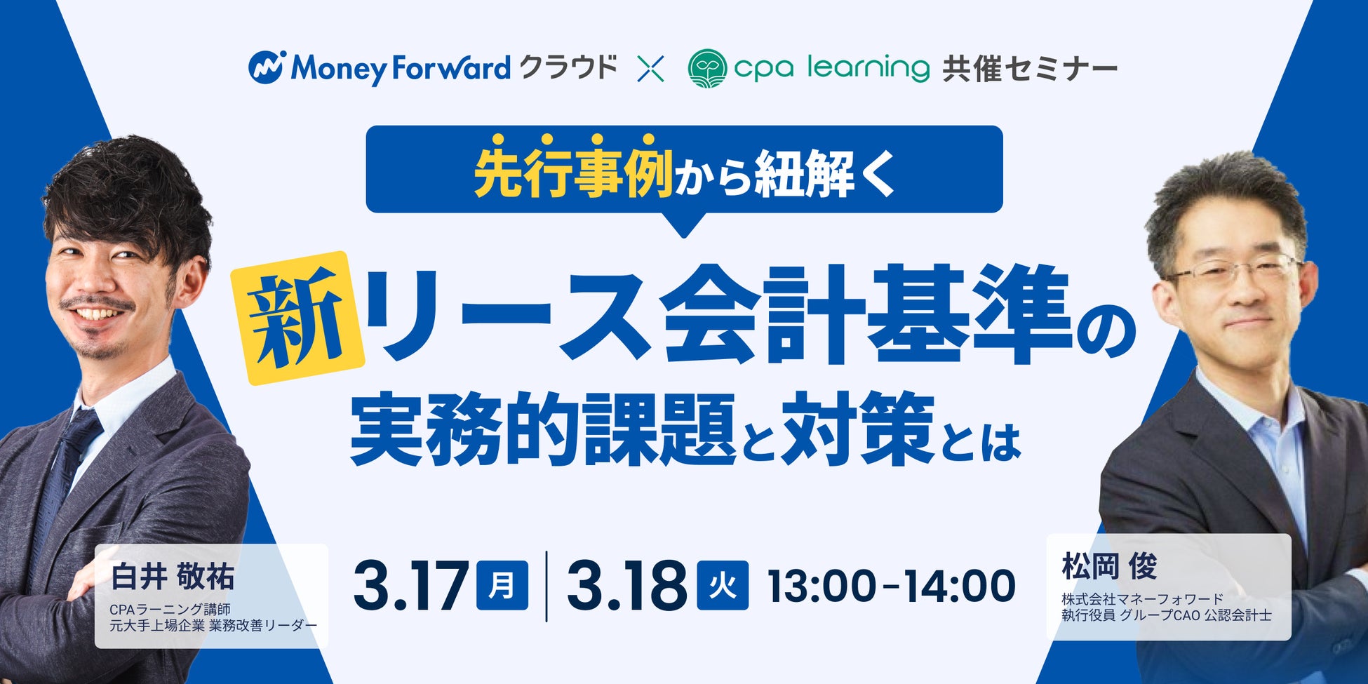 本セミナーは、CPAラーニング講師の白井氏をゲストに迎え、当社の執行役員・CAO(Chief Accounting Officer)の松岡とともに、新リース会計基準対応について議論します。当社の早期適用プロジェクトを先行事例とし、実務的な課題とその対策を深掘りします。プロジェクト内容を実際に公開しながら、リースの識別や社内外のコミュニケーションといった実務内容を紹介します。実際の現場で直面した課題や苦労を共有することで、効果的な解決策を考えていきます。