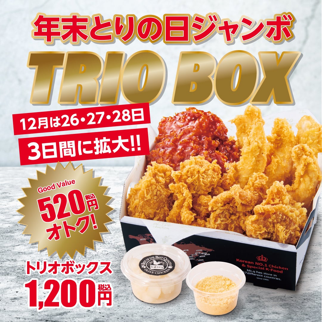 【bb.q オリーブチキン】年末とりの日ジャンボ開催!毎月28日「とりの日」限定販売の積み上げ価格から520円オトクな『トリオボックス』が12月は26・27・28日の3日間に販売期間拡大!