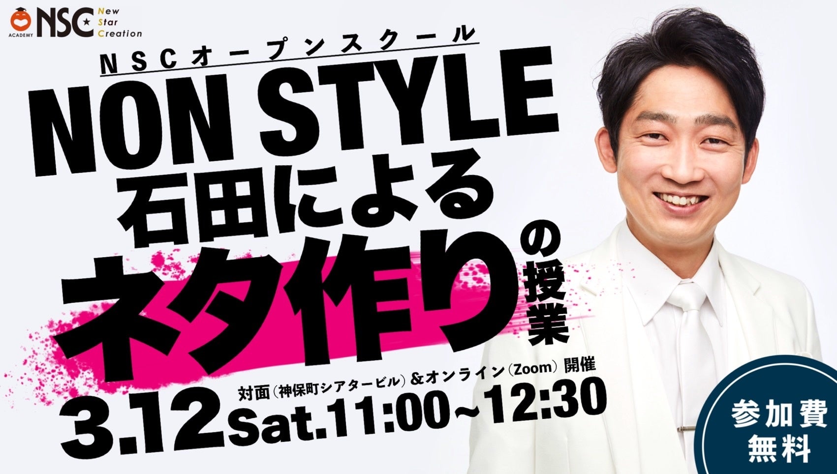 今年度からNSC講師を務めているNON STYLE石田によるネタの作り方の授業を、今回、オープンスクールとして開催。
