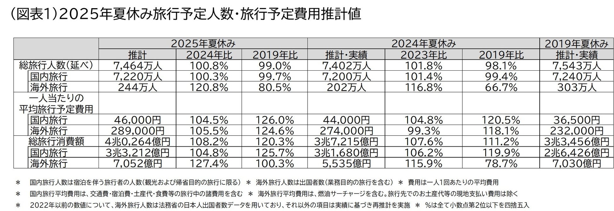 JTBは、「夏休み(2025年7月15日~8月31日)に1泊以上の旅行に出かける人」の旅行動向見通しをまとめました。本レポートは、1泊以上の日本人の旅行について、各種経済動向や消費者行動調査、運輸・観光関連データ、JTBグループが実施したアンケート調査などから推計したもので、1969年から継続的に調査を実施しています。