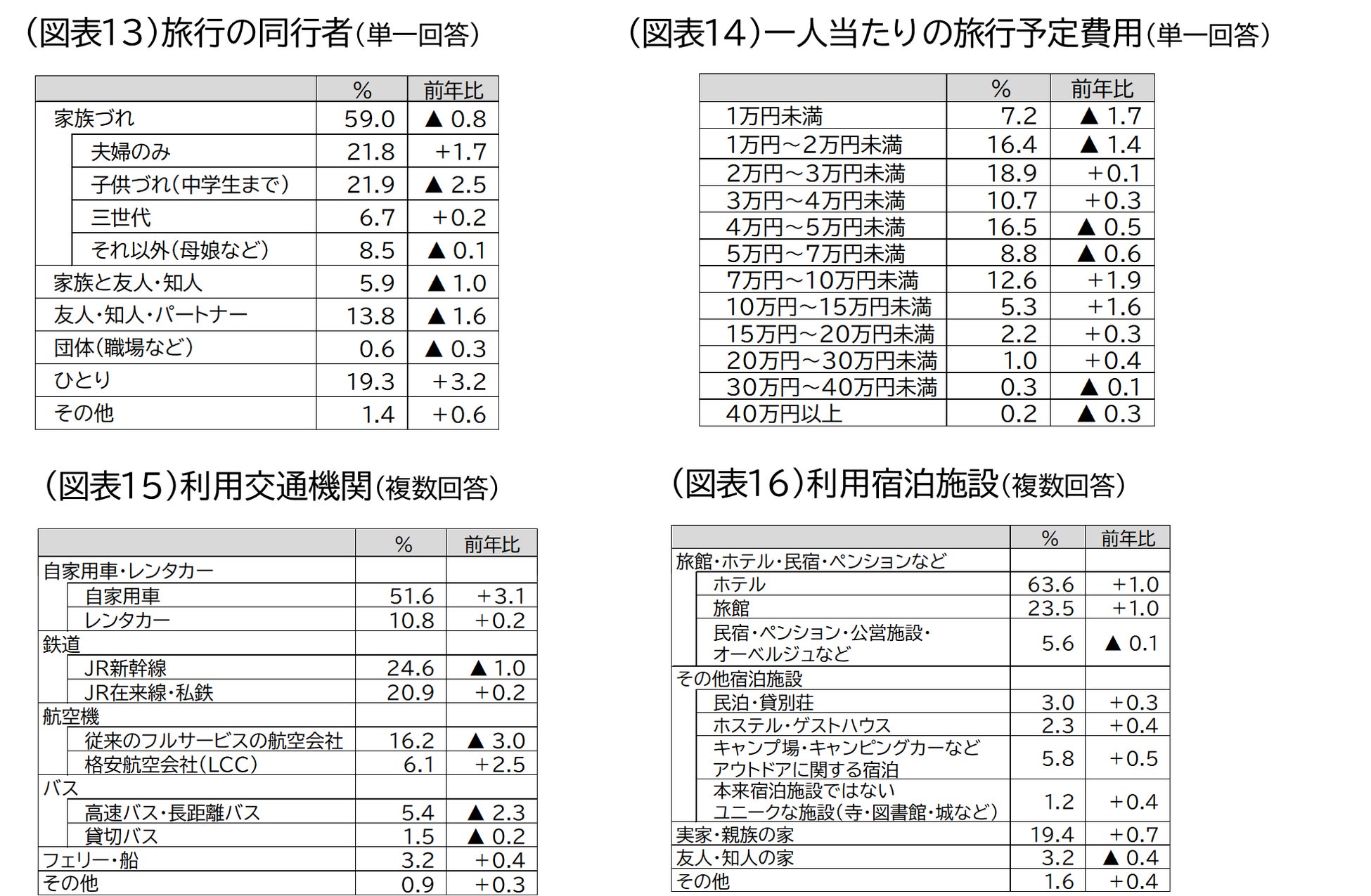 同行者:「子供づれ(中学生まで)の家族旅行(21.9%)」が最も多く、次いで「夫婦のみ(21.8%)」、「ひとり(19.3%)」の順となりました。前年からの増減に注目すると、「ひとり」と「夫婦のみ」が増加し、「友人・知人・パートナー(13.8%)」、「家族と友人・知人(5.9%)」は、減少しました。大人数で家族以外の親しい人との旅行が増えていた前年と比べ、今年は少人数の旅行が増える様子がうかがえます(図表13)。