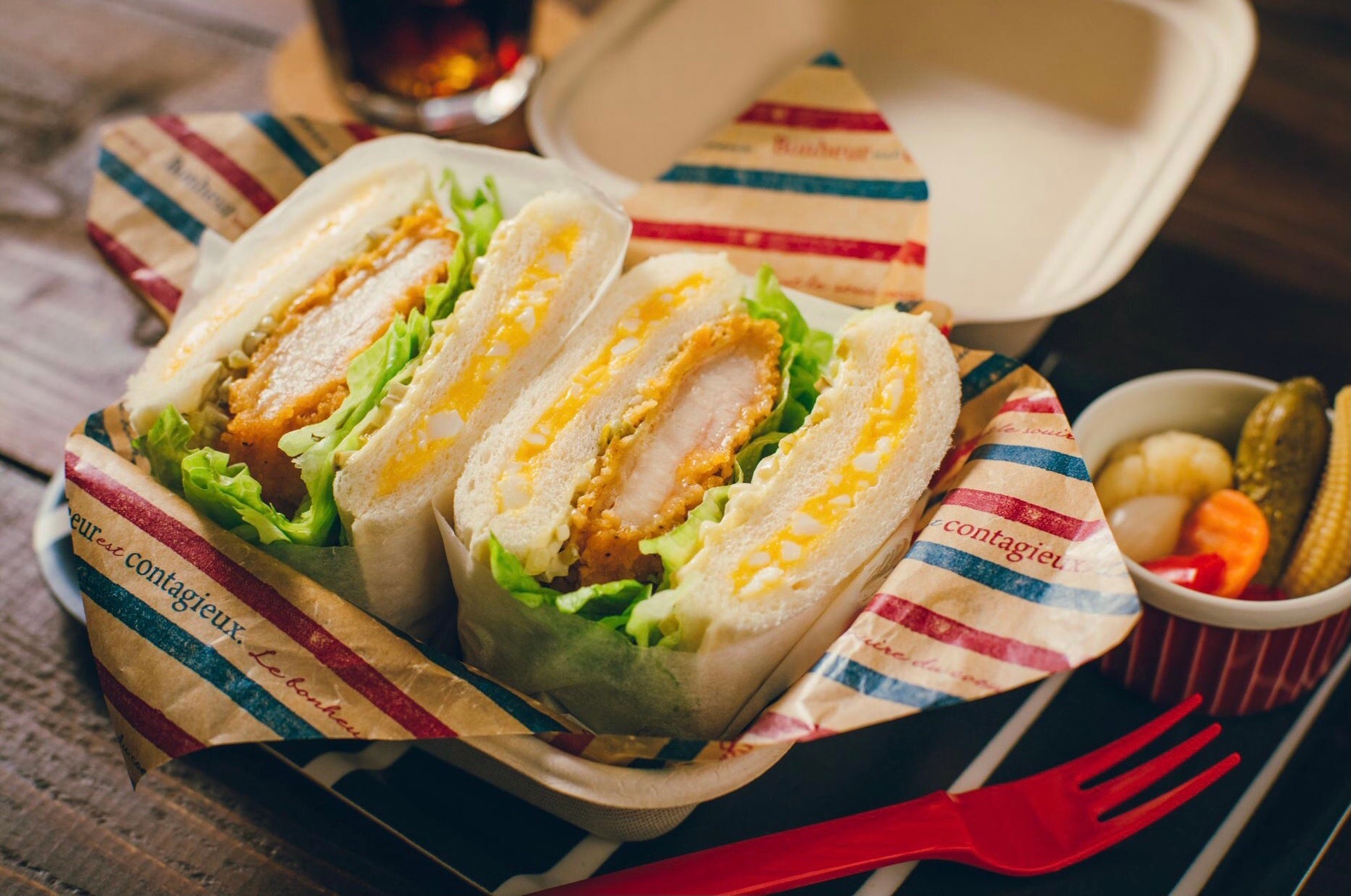 ①手間がかかるタルタルソース代わりに、ランチパックのたまごを生かした、チキン南蛮風サンド