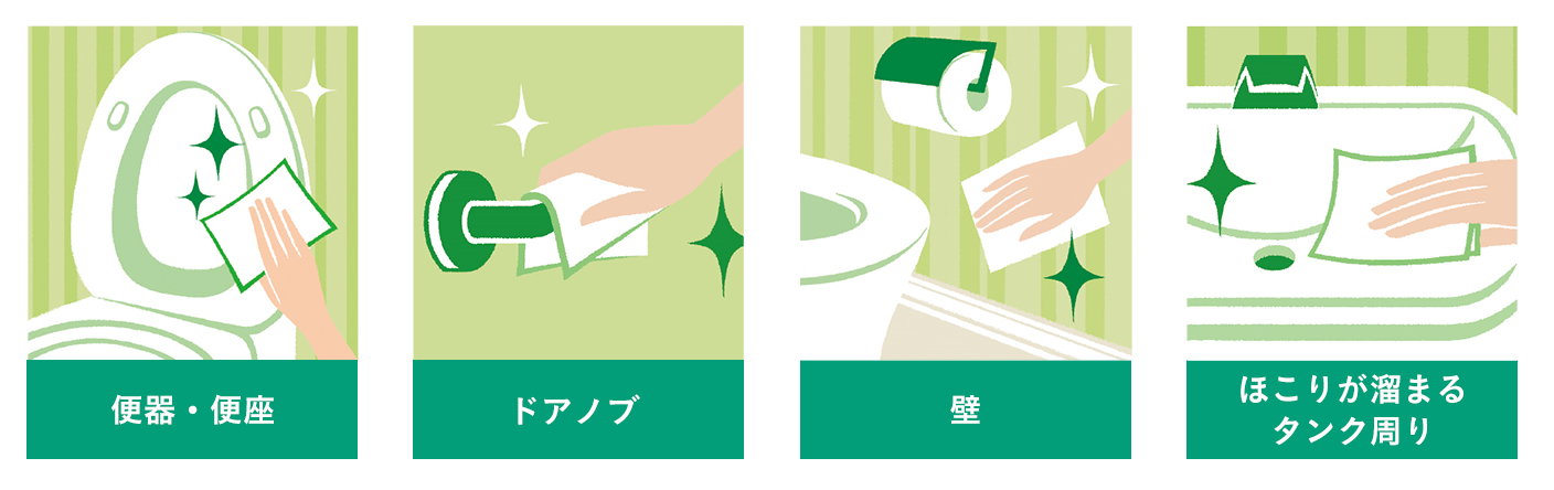 ●便器・便座はもちろん、ドアノブや壁、ほこりがたまりやすいタンク回りにも