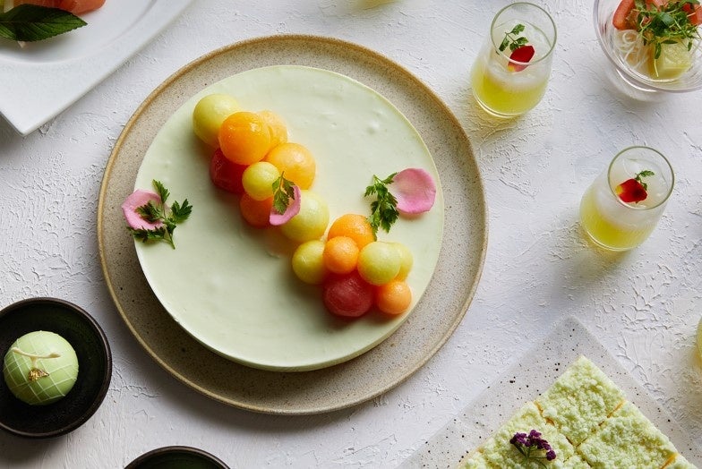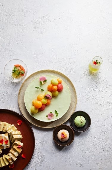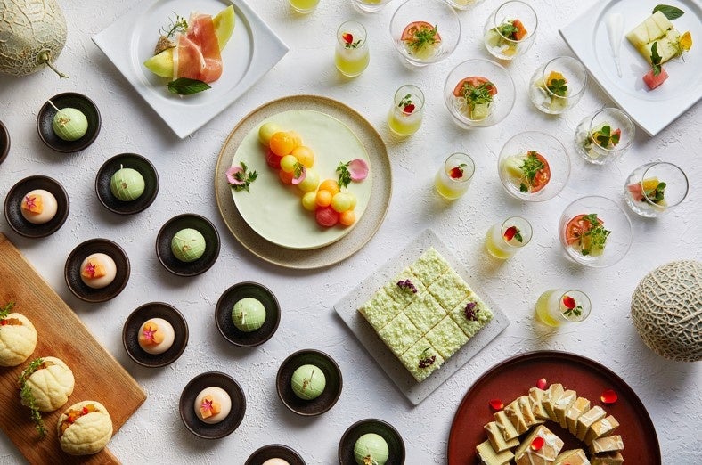本年夏のアフタヌーンブッフェでは、奈良県産のメロンをはじめ、爽やかな甘みたっぷりのメロンをふんだんに使ったメニュー、ドリンク約50種類が楽しめる豪華なブッフェをご用意いたします。「赤肉メロンのムース」「カラフルメロンとメロンレアチーズケーキ」など夏にぴったりの爽やかなスイーツから「メロンとモッツァレラチーズのカプレーゼ」「メロンの冷製スープ」などの趣向を凝らしたセイヴォリーまで多彩なメニューをブッフェスタイルでお好きなだけお召し上がりいただけます。また、使用するメロンの一部には地元奈良大和高田にある「静ファーム*」で作られる薫り高く甘みたっぷりのアールスヴェルダメロン「静ならメロン」を採用しております。