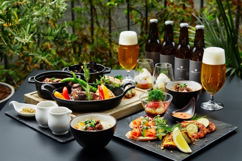 毎年人気のビアガーデンメニューに、今年は新しくJWマリオット・ホテル奈良オリジナルクラフトビールを生ビールでご用意いたしました。メニューは「ホタテ貝とトマトのシノワーズ風」「ムール貝のアヒージョ」などの新鮮な魚介メニュー、「大和ポークソーセージ」「ポークスペアリブ」などのうまみたっぷり肉料理のプレートをバーベキュースタイルでご用意し、4コースをご用意しております。