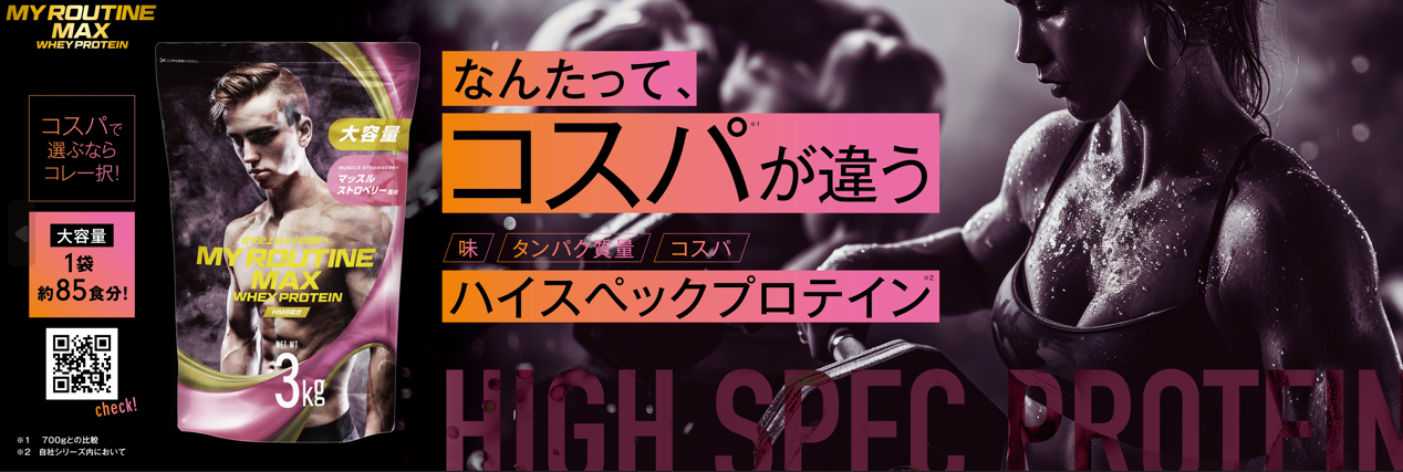 トレーニングする方やダイエッターのカラダ作りのサポートに効果的なホエイプロテイン。マイルーティーンMAX 3kgは、公式自社サイトの販売価格7,980円(税込)で、1食あたり93円※1を実現し、コストパフォーマンスの高い商品となっています。日常的に多くのプロテインを摂取するアスリートやスポーツをおこなっている方には、大容量タイプがおすすめです。※1 1食あたり35gで約85食分換算の場合