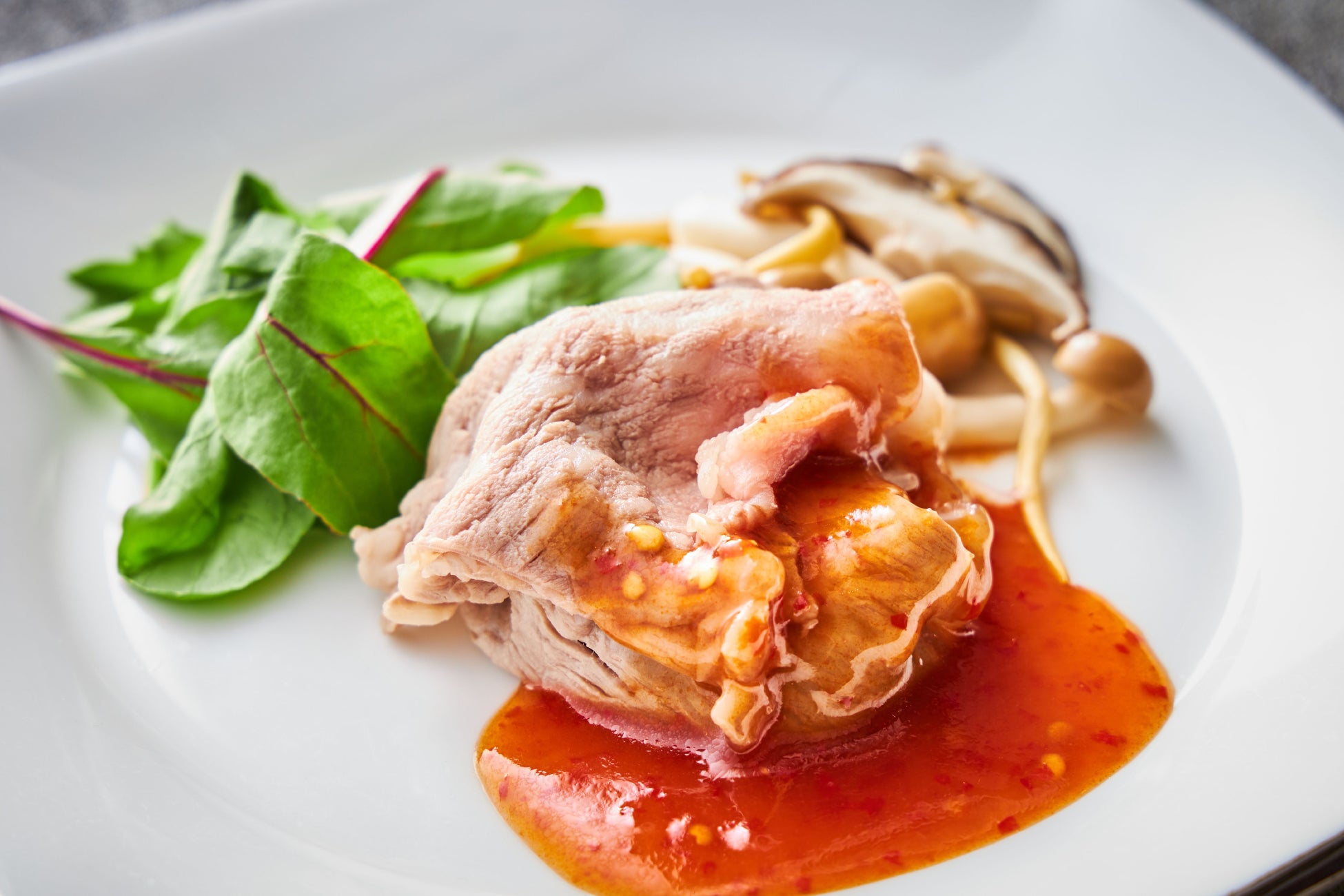 和牛ときのこ湯引き ガーリック辛子ソースかけ