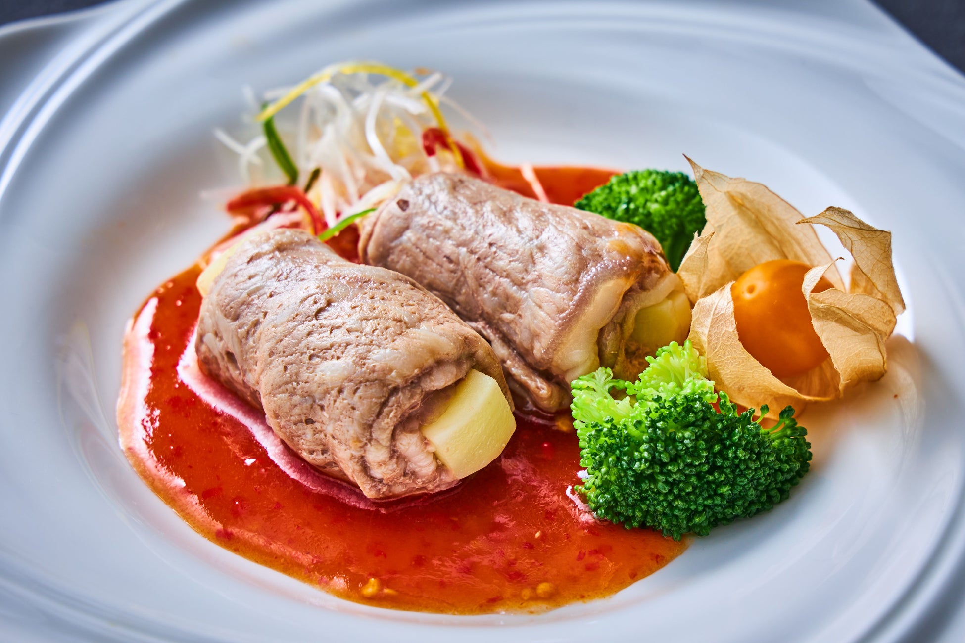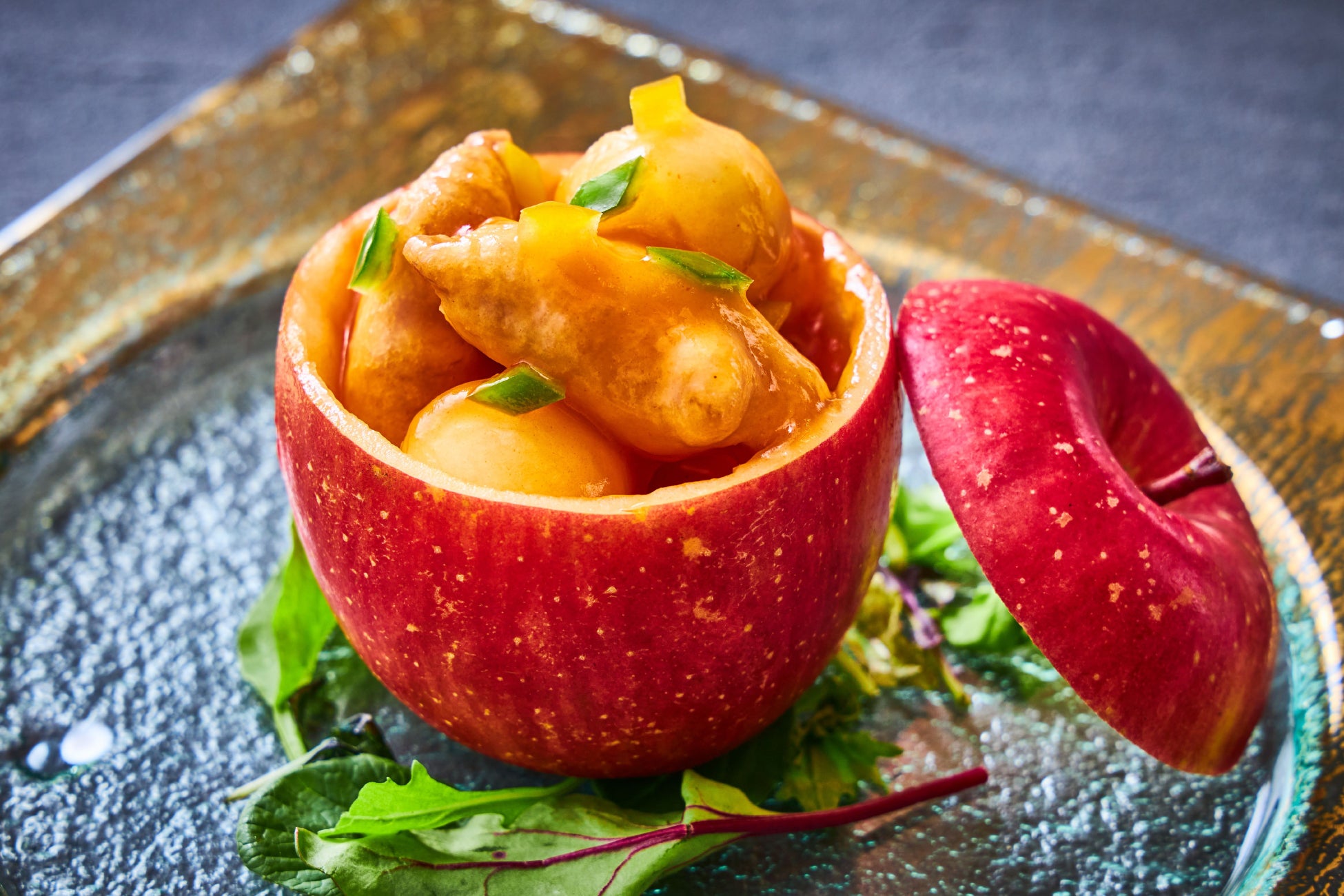 信州産のりんごをまるごと器にし、見た目も楽しめる一品です。料理長が得意とするフルーツの甘みを利用し、辛さだけではない旨みが増幅される調理法で、豚肉の衣揚げをさっぱりお召し上がりいただけるよう仕上げました。