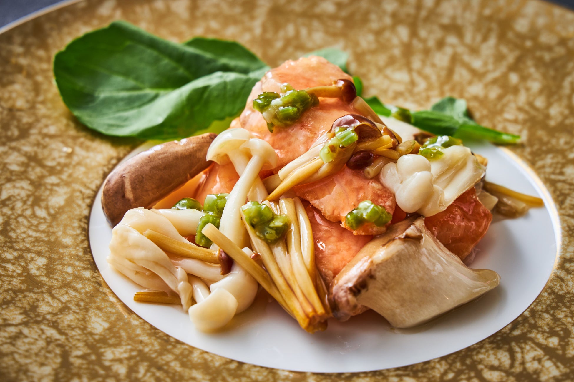 長い年月をかけて開発された、海のない長野県の自慢の魚「信州サーモン」と同じく特産のきのこの炒め物です。トロリととろけるサーモンの脂ときのこの風味と旨み、味を引き立てる刻みわさびの食感と香りをお楽しみください。
