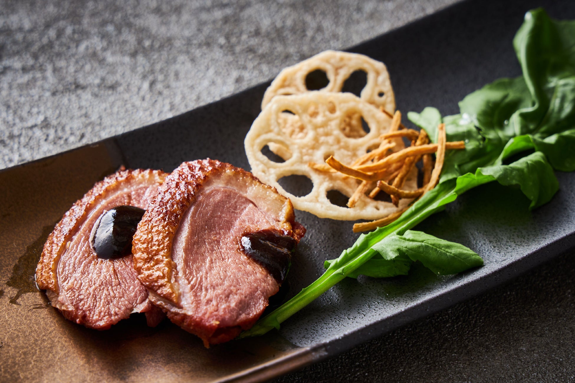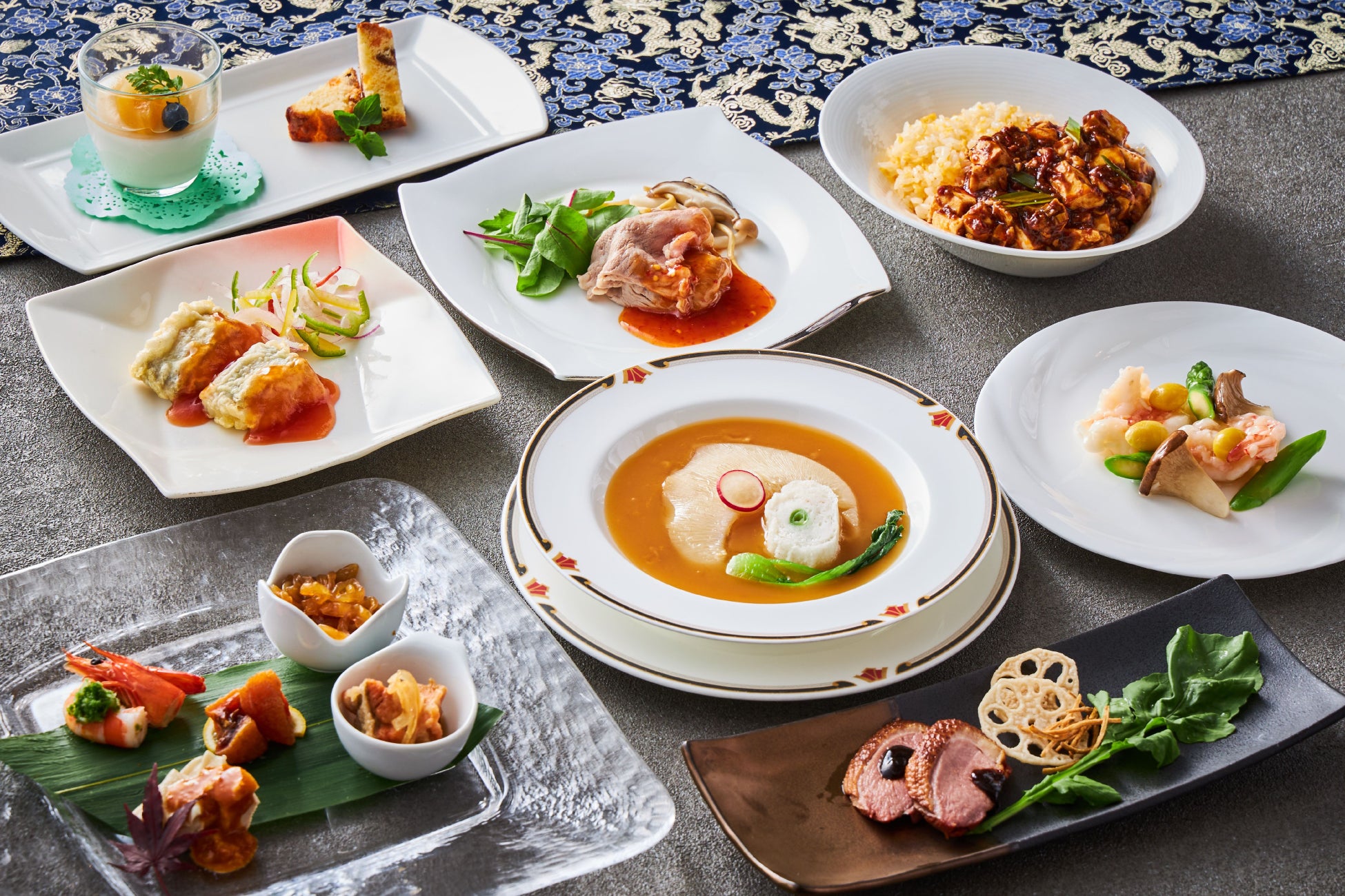 バランス良く仕上げた全8品のおもてなし料理をご用意いたしました。厚みのあるふかひれを贅沢に一枚使用した“ふかひれ姿煮 絹笠茸添え”では、「紅焼(ホンシャオ)」と呼ぶ中国の伝統的な味付けであるとろみのついた醤油風味煮込みをいんげんに魚のすり身を巻いた絹笠茸と一緒にご堪能ください。日本人好みにアレンジした“和牛ときのこ湯引き ガーリック辛子ソースかけ”では、余分な脂を落とし、食欲がそそる特製ソースでさっぱりとお召し上がりいただける一品に仕上げています。“四川ダック 黒味噌をつけて”では、こんがりとローストした皮付き鴨肉を長期熟成させた少し甘みのある黒味噌でお楽しみいただける一品です。お食事は2種類からお選びいただけ、中でも人気の四川麻婆豆腐と炒飯を一度に味わえる “四川麻婆豆腐かけ炒飯”がおすすめです。食後のデザートでは季節の味わいをプラスした“杏仁豆腐の桃ソースかけ”と、濃厚なコクがありながらも軽い口当たりで、上質な味の“バターケーキ”をお楽しみください。
