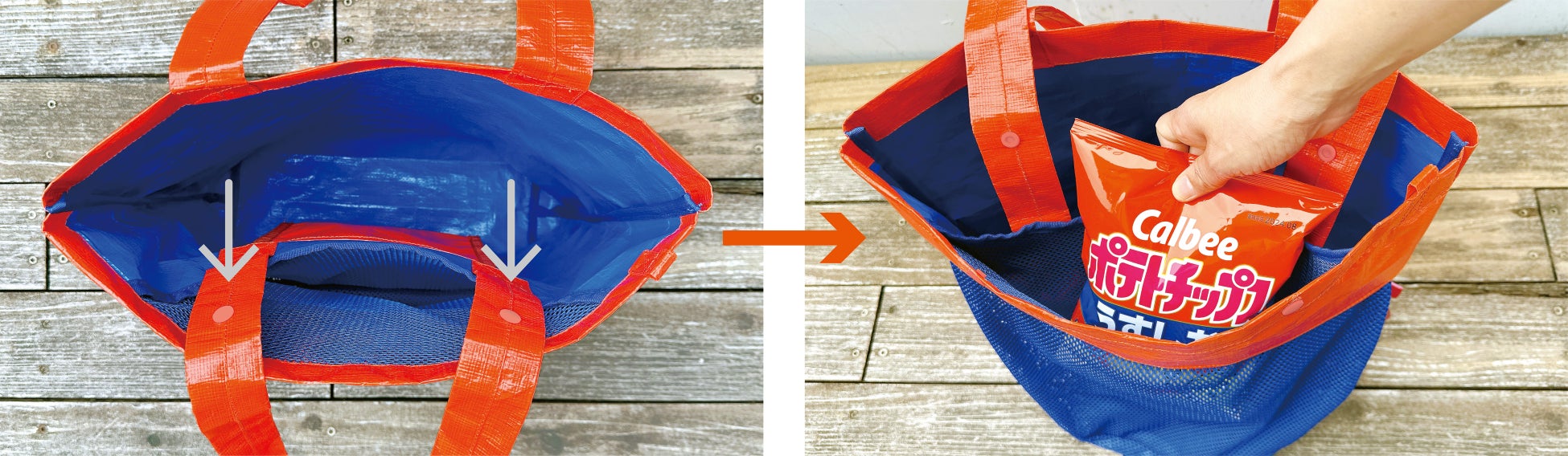 前面のスリットから飛び出す「ルーポケット」が膨らんで、収納量を倍増させることができるので、トートバッグひとつで60gの「ポテトチップス うすしお味」なら最大12袋も持ち運ぶことができます。毎日のスナック菓子の購入にはもちろん、お気に入りのスナックといっしょの行楽や、旅先の限定フレーバーをおみやげにしたい時も大活躍。同時発売のポテトポーチをチャームとして取り付けて、ポテトチップス愛全開でお出かけを楽しむのもおすすめです。