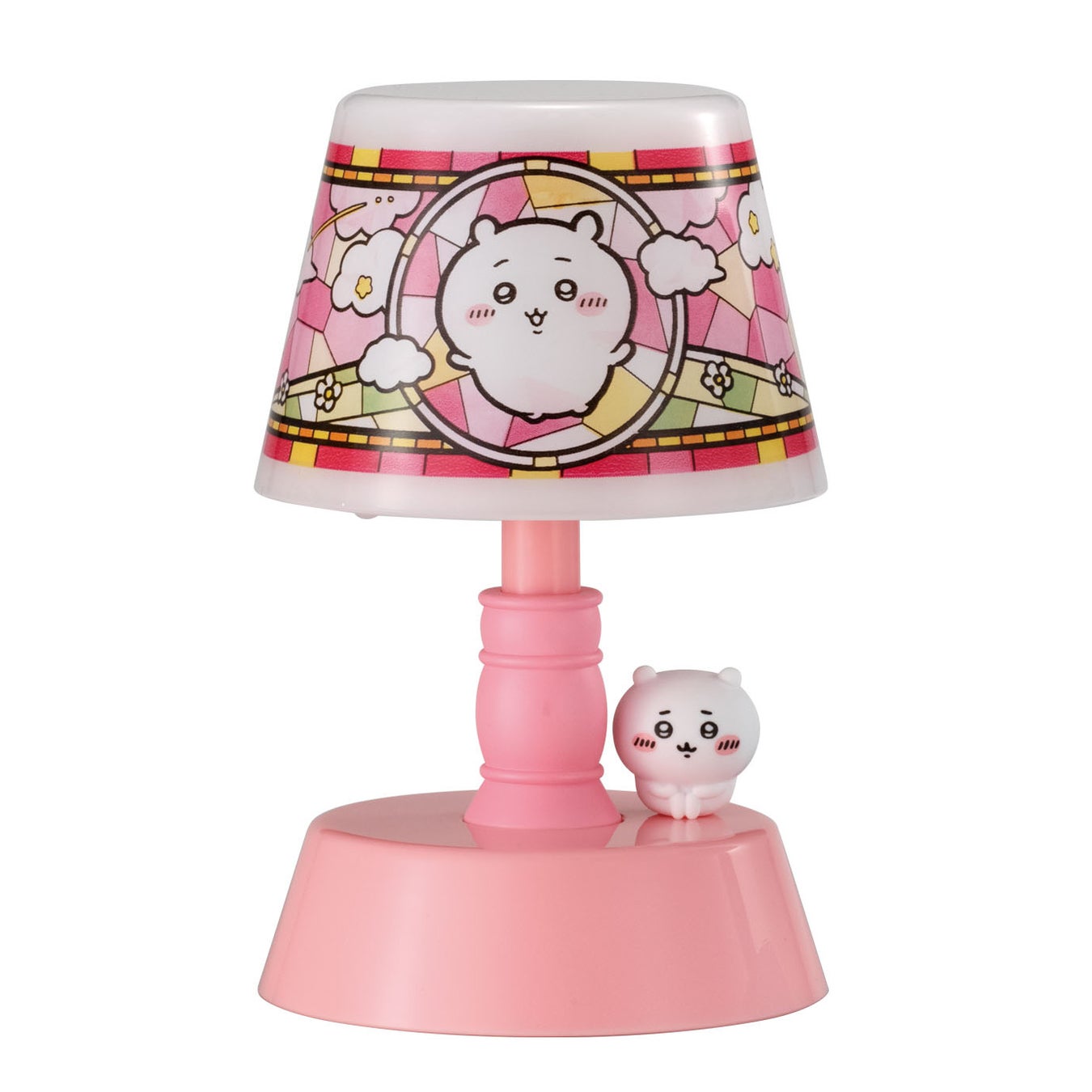 組み立てると高さ約10cmの小さなスタンドライトに。全種光ります。ステンドグラス風のデザインとライト下にちょこんと座ったちいかわたちがポイントです。