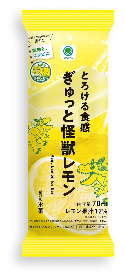 ファミリーマートはこのアップサイクルの取り組みに賛同し、「怪獣レモン」を使用したアイスバーを「産地と、コンビに、」シリーズとして発売いたします。今回発売する「とろける食感 ぎゅっと怪獣レモン」には「怪獣レモン」の果汁を12%使用しており、爽やかな酸味と優しい甘さを楽しめる仕立てとなっております。 ファミリーマート公式HPでは、産地との取り組みについてより多くの皆さまに知っていただきたく、「産地と、コンビに、」特設ページを公開しております。