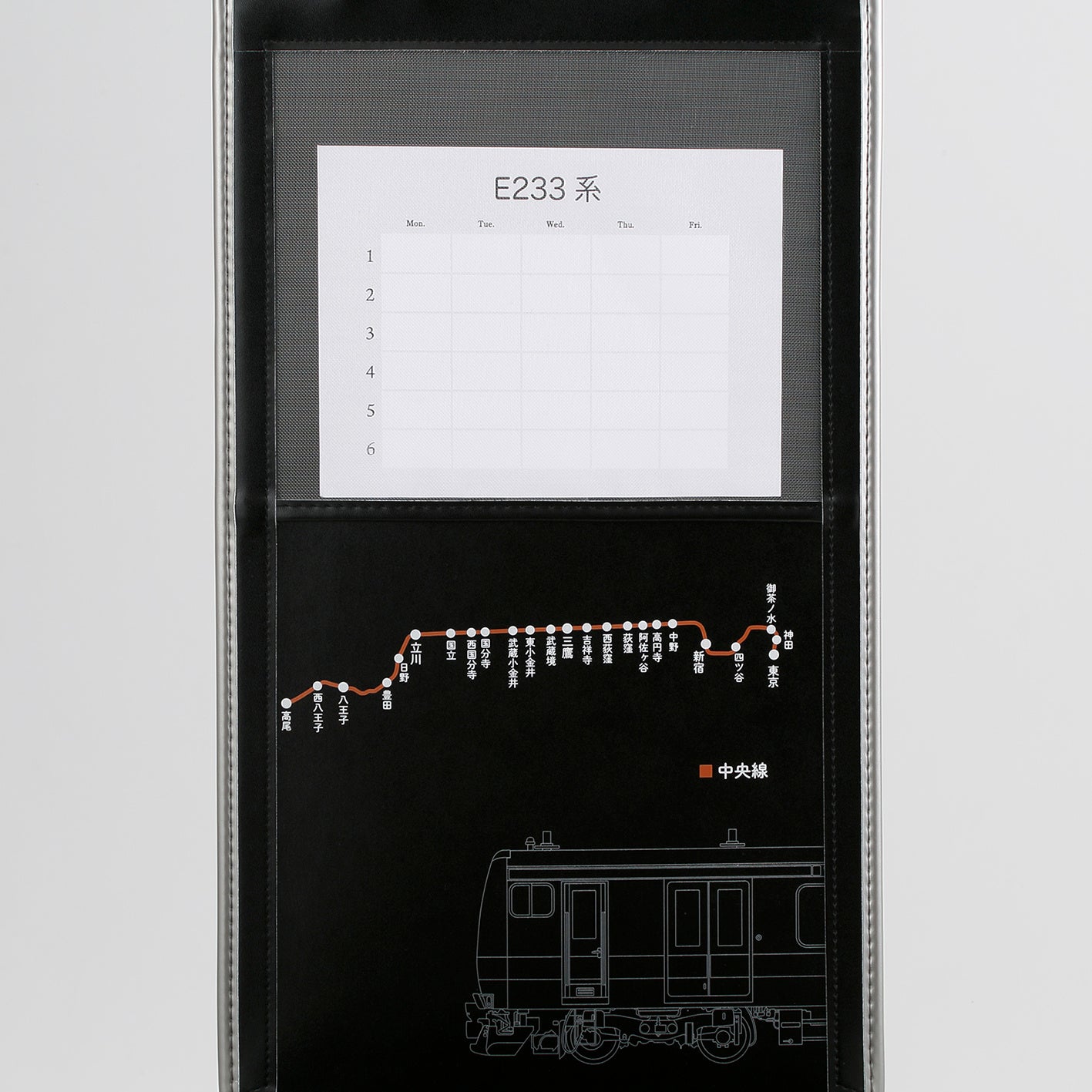 東京駅から新宿、立川、高尾方面へ繋ぐ中央線E233系をモデルにしたランドセル。オレンジの帯をまとった車両デザインをモチーフにしました。かぶせ裏には、中央線の路線図がプリントされています。