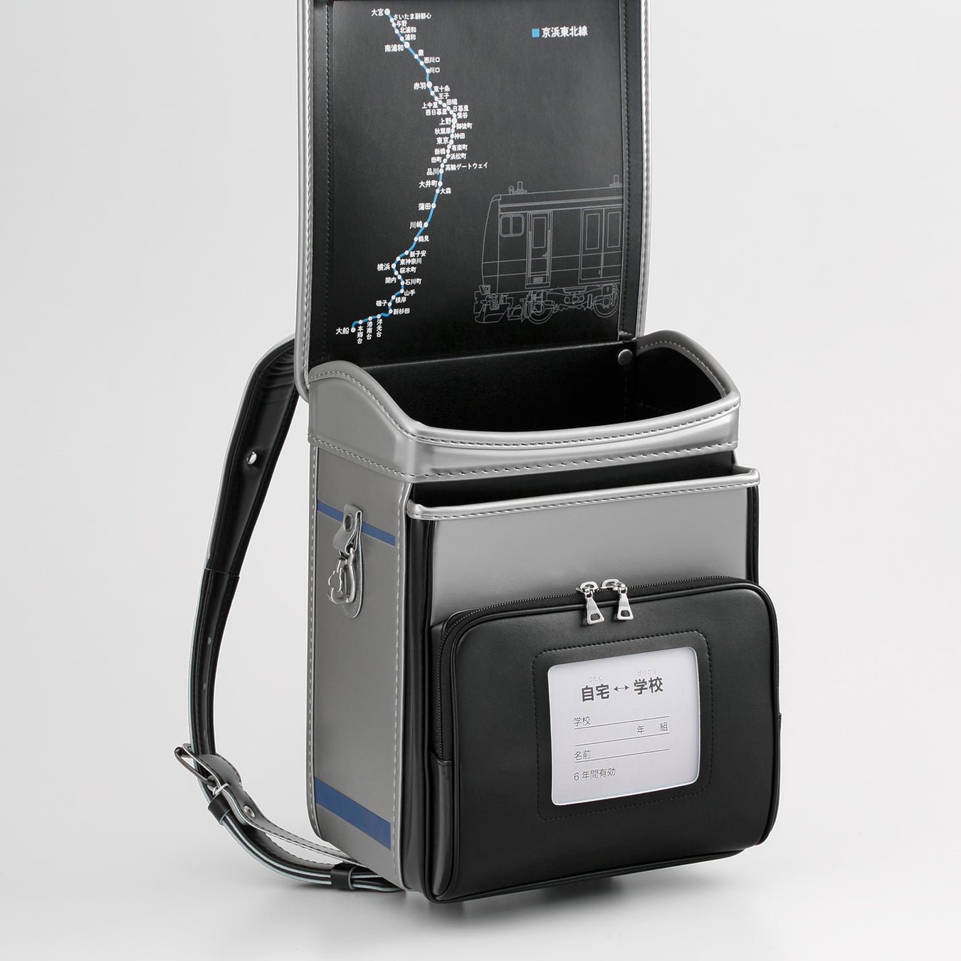 車両の先頭形状をランドセルのかぶせ部分に反映し、耐久性のあるステンレスボディの質感など鉄道車両の機能美をランドセルで表現。錠前は、指1本で簡単にくるっと開き、磁石の力でピタッと閉じる「くるピタ(R)」を採用し、お子さまが使いやすい工夫を施しました。 ※高島屋限定販売