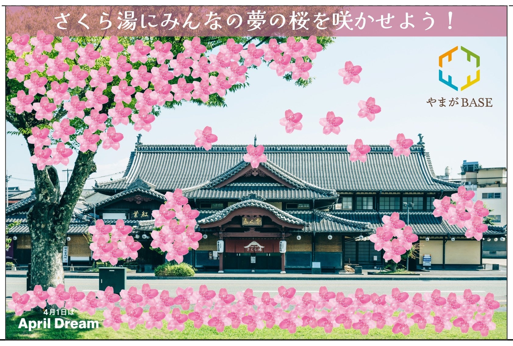 熊本県山鹿市の旧千田小学校跡地を活用した複合施設iReactionハブ「YAMAGA BASE」。実は運営するやまがBASE株式会社は、2023年のApril Dreamに参加し同社が2024年4月1日に「YAMAGA BASE」をオープンすることを夢で掲げました。 同社自身が夢の発信からも多くの協力者に出会い、実現の後押しになった実感いただいており、夢を発信することで生むポジティブなエネルギーを多くの方に感じてもらいたいと、パートナーに参画。3月30日、31日に開催する施設のオープニングイベント内では参加者が夢を書ける「夢の桜プロジェクト」を実施します。