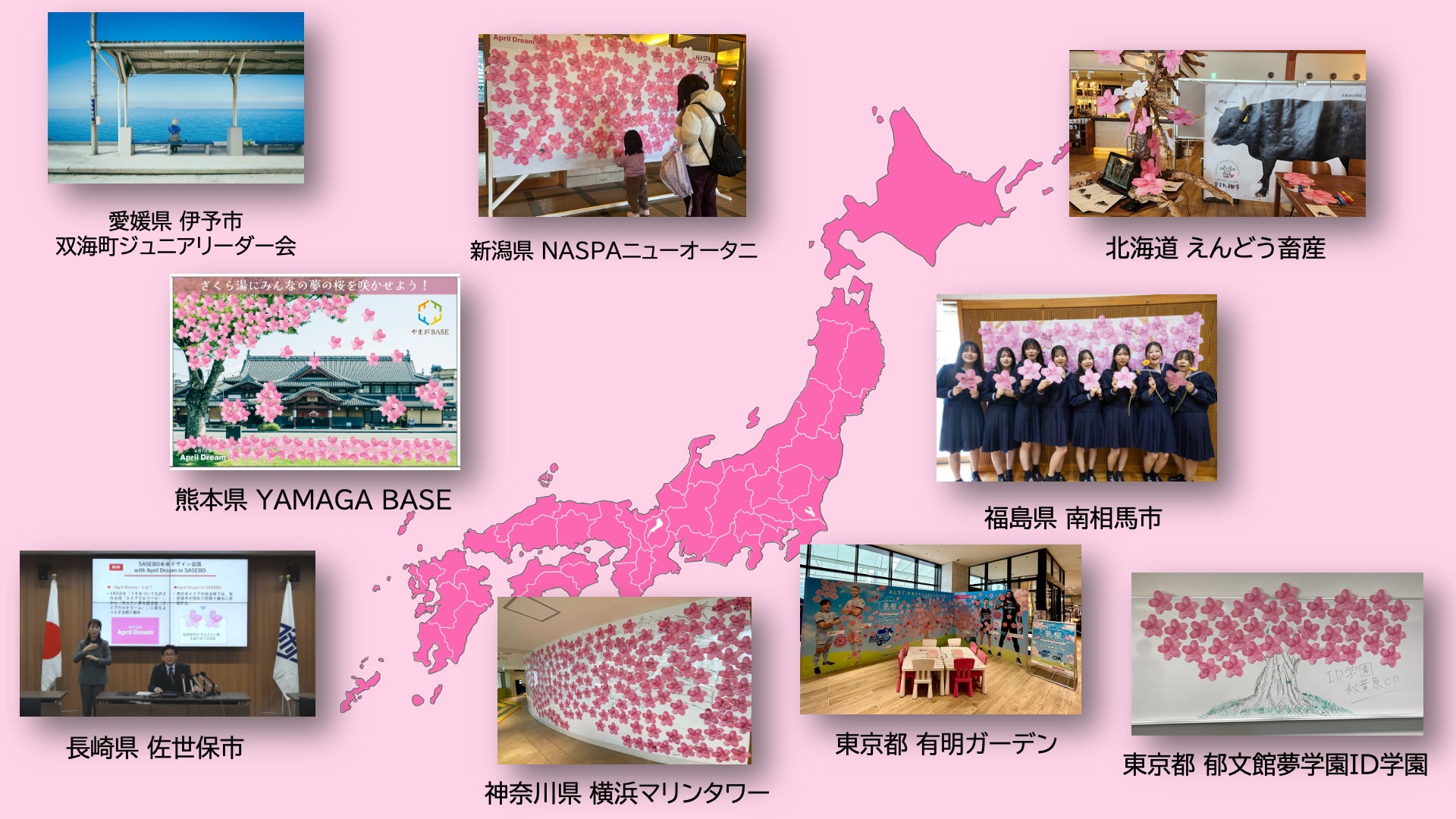 2024年は東京山手線に全国からの夢が集まり、46道府県の駅にも地元の夢が集まります。徐々に、全国に広がる「4月1日に夢を発信しよう」というApril Dream。北海道から熊本県まで全国40以上の企業や団体・自治体から夢を発信するための桜が欲しいと問い合わせいただき、全国各地で地元の方が参加できる夢発信イベントが開催されています。