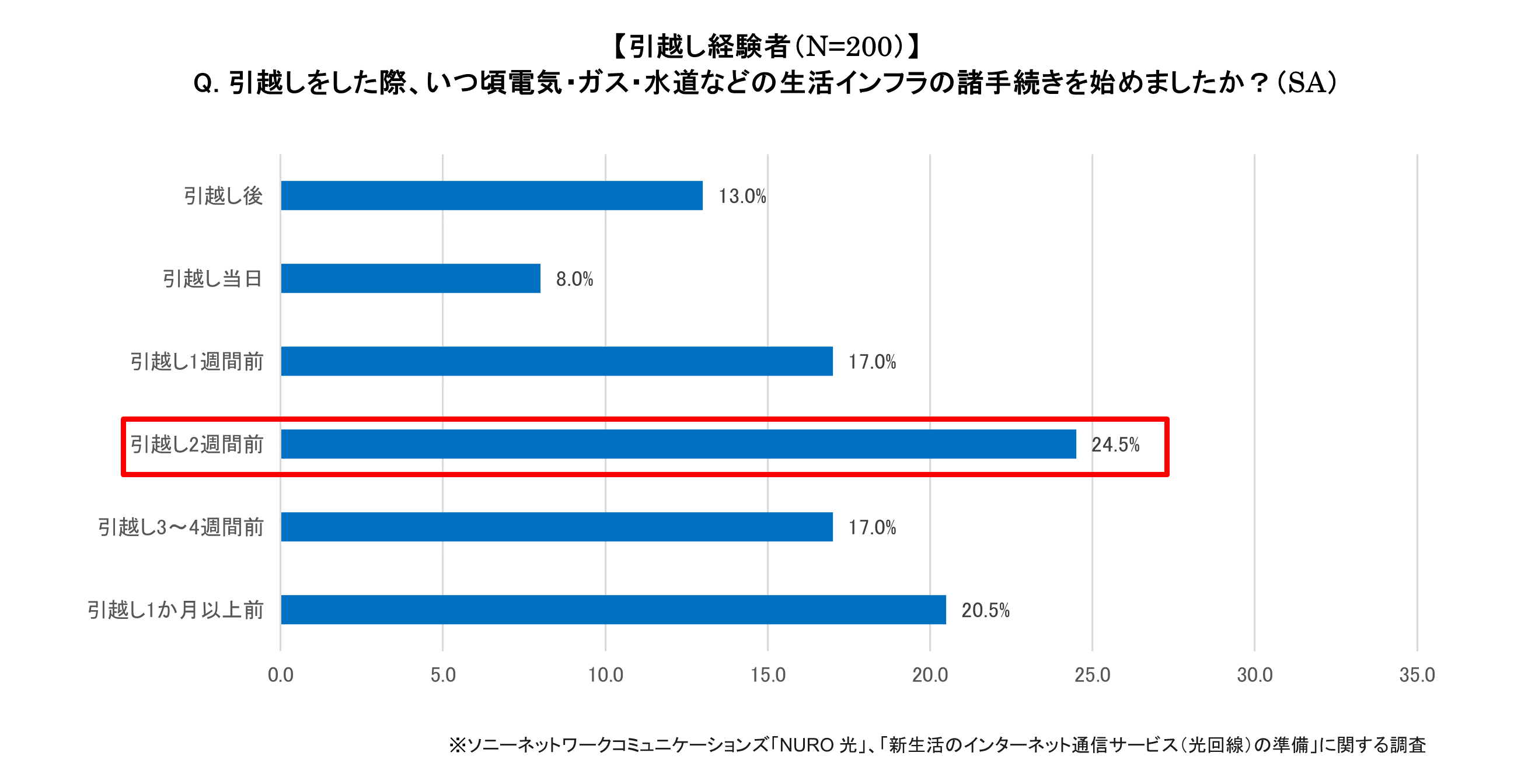 引越し経験者に、引越しをした際いつ生活インフラの手続きを始めたのか聞いたところ、電気・ガス・水道などは「引越し2週間前(25%)」の回答が最も多い結果となりました。一方、インターネットの手続きは「引越し後(35%)」が最多となり、電気・ガス・水道の手続きに比べてインターネットの手続きは後回しになっていることがわかりました。