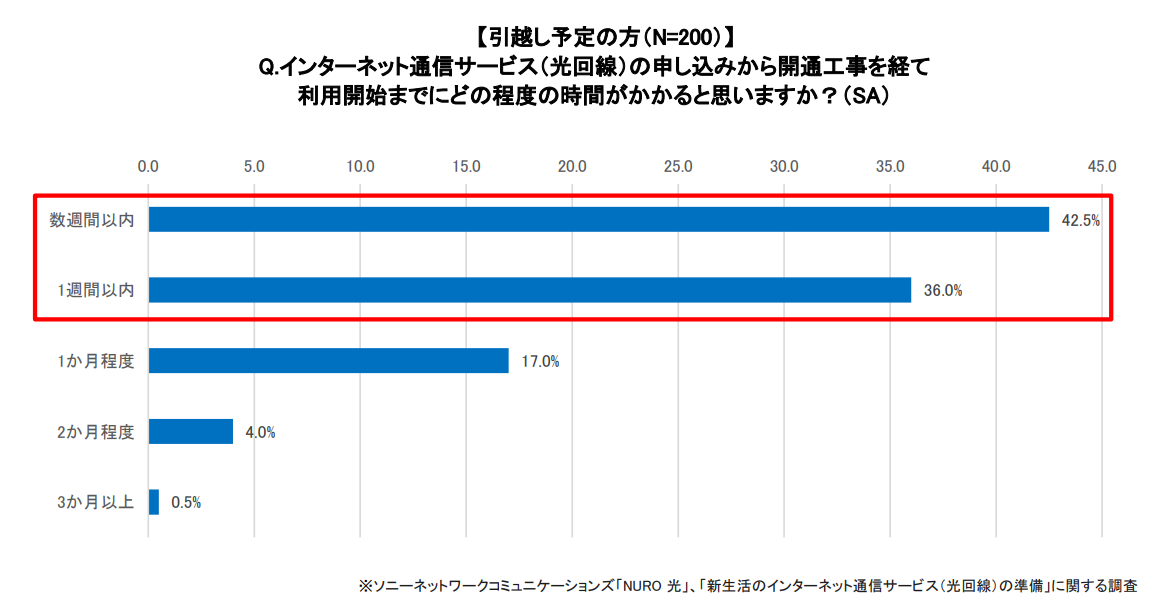 引越し予定の方にインターネットの開通までの想定時間を聞いたところ、「数週間以内(43%)」が最も多く、続いて「1週間以内(36%)」の結果となり、引越し予定の方も同様に、インターネットの利用開始までに開通工事があることは理解していても、開通までに時間を正しく把握できていないことがわかりました。今年もインターネットの準備にかかる時間の想定ミスにより、『一時的ネット難民』が多数発生する可能性があります。