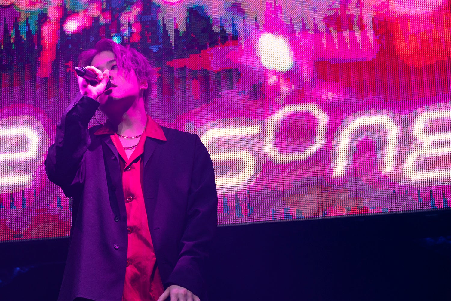 流れ、スターレスに所属する各チームがスクリーン上に紹介されていく。まるで号砲のような音に導かれるように、ステージに光が注ぐとそこにはシンガーの姿が。「行くぞ福岡ーー!」とチームKのシンガー・ケイの歌声を担う藤田玲。「よろしくーー!」と続いたのはチームWのシンガー・晶の小林太郎。そして鳴り出したのは「Outsider BLACK SONIC ver.」。ずらりと並んだ9人のシンガーが次々に歌声を繋いでいく一曲は、コンテンツの4周年を祝したナンバー。そもそもは3曲を自由に組み合わせることができるという画期的なアイディアで生まれた一曲はそれぞれの曲のカラーはそのままに熱く轟く一つの曲へと変貌を遂げていた。「福岡、救国されたいかー!」と叫ぶ藤田の声に会場から歓声が沸き、ライブはチームKの「During the demise」へ。低く唸るギターリフが紡ぐナンバーをソウルフルに歌い上げる藤田の声に吉野のシンガー・齋藤知輝のラップが加速をかける。2019年に届けられたシーズン1第1章のメインテーマであり、長くファンに愛され続ける一曲がバンドの生演奏の音によって熱を増すのを感じさせた。エレクトリックなイントロにエモーショナルなギターが乗ると「ヘイ。ご機嫌よう。群れるだけの脳のない家畜……」と呟くTakuya IDEが登場し、チームBの圧倒的なパワーを宿す「日蝕」を歌う。チームBの、ヒースMC・IDEのマグマのような熱を内包するアグレッシブなヒップホップチューンがバンドアレンジで圧倒的なパワーを帯びた。ガラリと雰囲気を変えたのはチームPの「虹の彼方へ」だ。伸びやかなマイカの歌声をシンガー・Kradnessが響かせる。柔らかなギターとドラムが紡ぎだすダンスビートにフロアではピンクのペンライトが右へ左へと揺れる。爽快なポップチューンがチームPここにあり!と宣言するように会場を包み込んだあとには「さぁ、福岡!今日1日、盛り上がっていこう!」という声が。チームCの柘榴シンガーのしゃけみーが紫の光を帯びたステージへと登場すると、「Purple Dawn」によってフロアが夜明け独特の色に浸食されていく。ドラムとベースとが生み出すダンスビートは力強く響き、普段の「Purple Dawn」とはひと味どころではない熱さを持ってオーディエンスを圧倒していく。シャンシャンシャンシャン!ハイハットでのドラムカウントでギターとベースが唸る。「ブチあがろうぜ!福岡―!」と叫ぶ小林。昼の部を牽引するチームWだ。2019年のシーズン1第2章を彩った「Breakin’it faster」が轟き、会場は一体となって声をあげて歌う。水色のペンライトが竜巻を起こすように激しく揺れ、ラウドに鳴るバンドの音がフロアを席巻していくのを感じる。そもそもバンドサウンドとの親和性の高かったチームWの曲はここで真価を発揮するように会場を震撼させた。