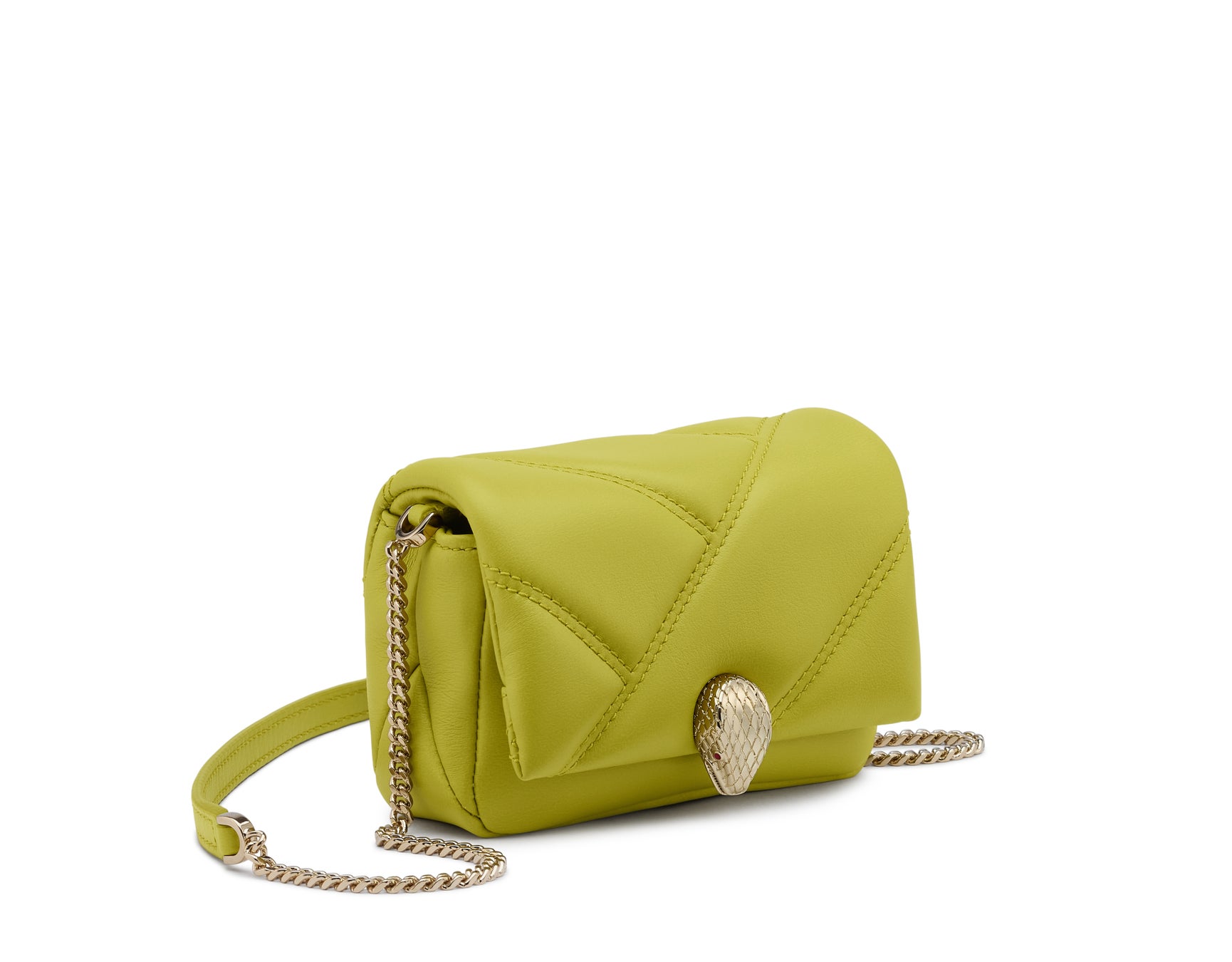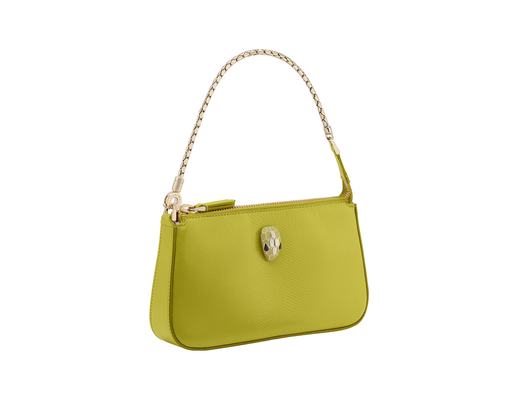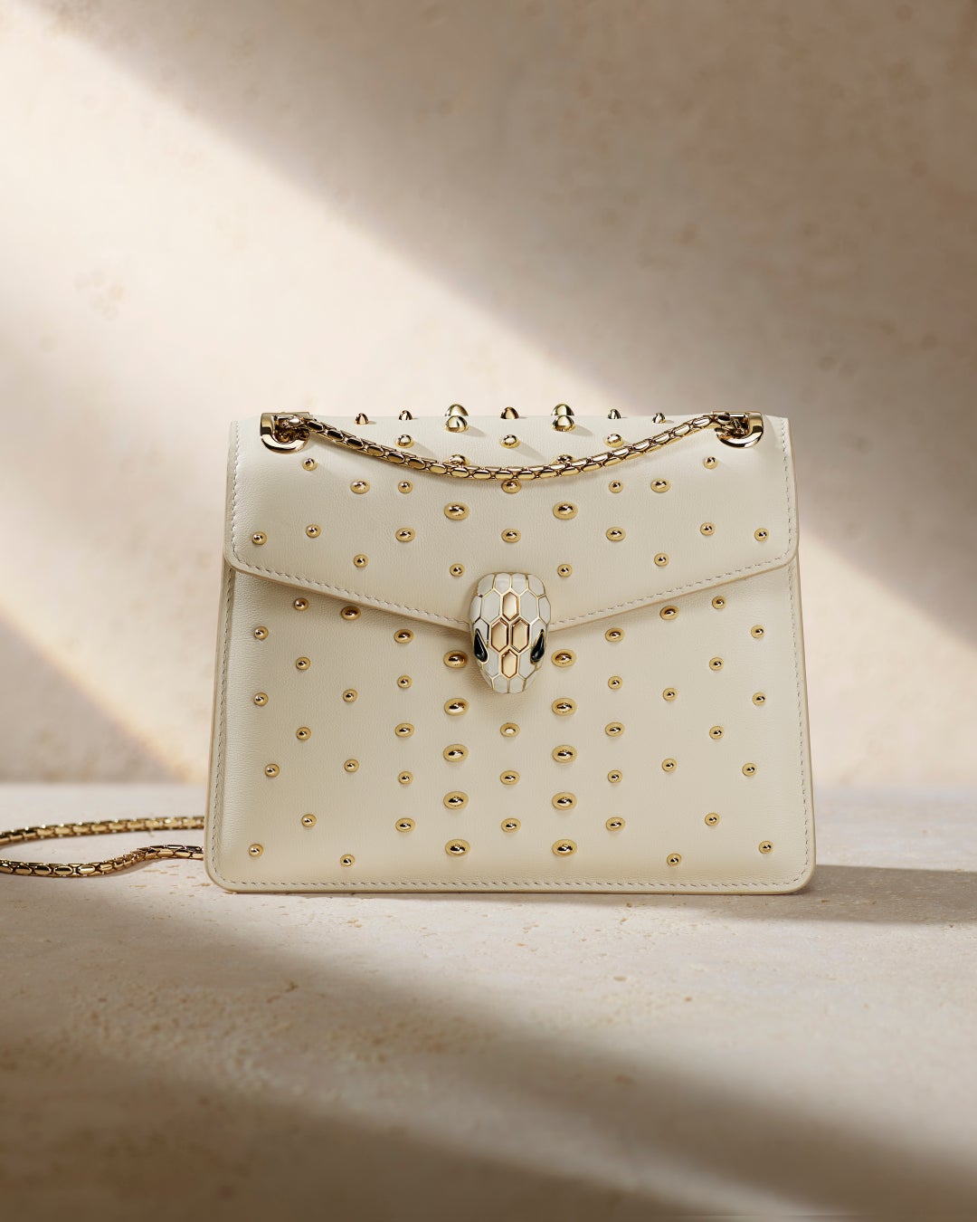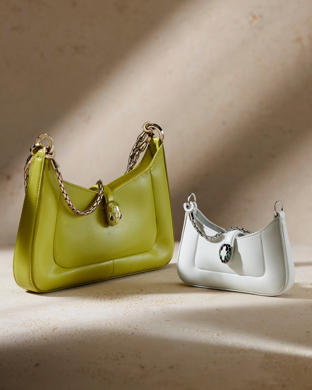 美しい春の訪れを告げる瑞々しいグリーンを彷彿させる新色のネイチャーカラー、リンデンペリドットが「セルペンティ」コレクションよりハンドルバッグやスモールレザーグッズまで様々なフォルムで登場いたします。そして、リニューアルされた「セルペンティ フォーエバー」コレクションからのバッグはこのシーズンにふさわしい爽やかなホワイトカラーに、ブルガリのシグネチャーであるカボションカットの装飾が美しいバッグが登場します。丸みを帯びたセンシュアルなシルエットがプレシャススキンに降り注ぐ光の雨のように輝くこのバッグは、蛇を象ったメタルチェーンストラップをショートからロングダブルに長さを変えられるよう2通りのショルダーキャリーに加えてクロスボディの持ち方もできる機能性に優れたデザインにアップグレードされています。