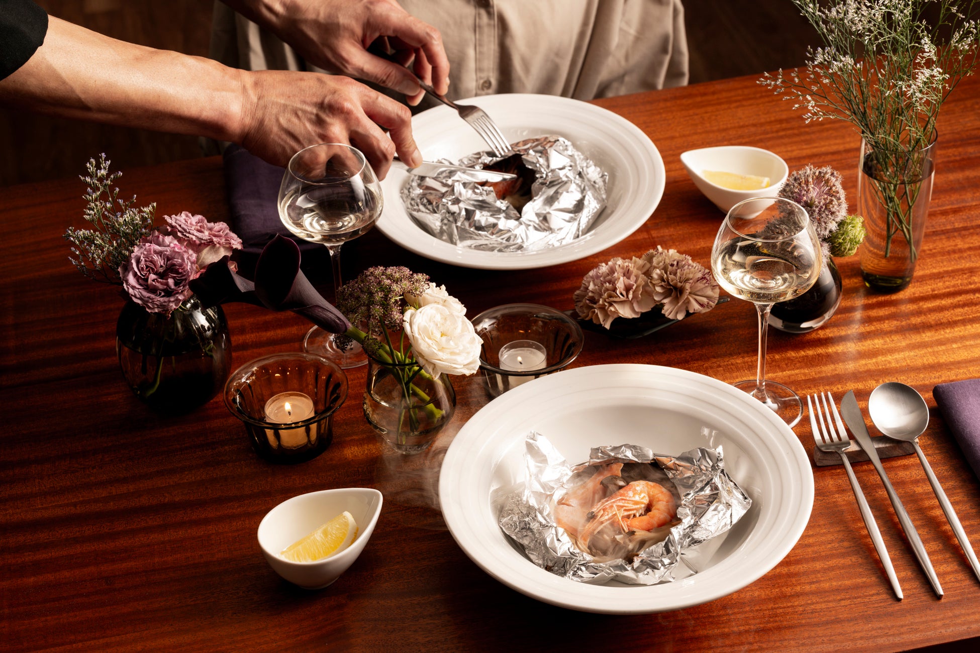 栗や茸、柿といった実りの秋を代表する食材を盛り合わせた、見た目からも秋を感じるアミューズからはじまり、温前菜ではシェフのフランス修業の思い出の品、星付きレストランのスペシャリテをアレンジした鴨とりんごのシャルロット仕立てをご提供。スパイスの効いたパンドエピスの中に、甘酸っぱい信州りんごとコク深い鴨の煮込みを詰めた、ディジョン地方に伝わる秋らしい1皿です。魚料理はお客様の前でホイルを割る演出で、松茸の芳醇な香りをお楽しみいただけます。肉料理は2皿ご用意。長野県産プレノワールのガランティーヌを酸味のあるシャインマスカットソースでいただく1皿と、信州プレミアム牛サーロインとフォアグラをロッシーニ仕立てにした贅沢な1皿で、信州が誇るお肉の味わいをご堪能いただけます。軽井沢の秋をイメージした、りんごと栗のリキュールを用いたシーズナルカクテルも合わせてお楽しみください。