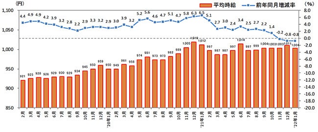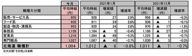 [北海道版]2022年1月度 アルバイト・パート募集時平均時給調査 北海道の1月度平均時給は前年同月より8円減少の1,004円