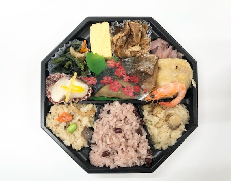 縁起の良い八角の容器に、「ぶり」「えび」「小豆(赤飯)」「レンコン」など縁起満載!