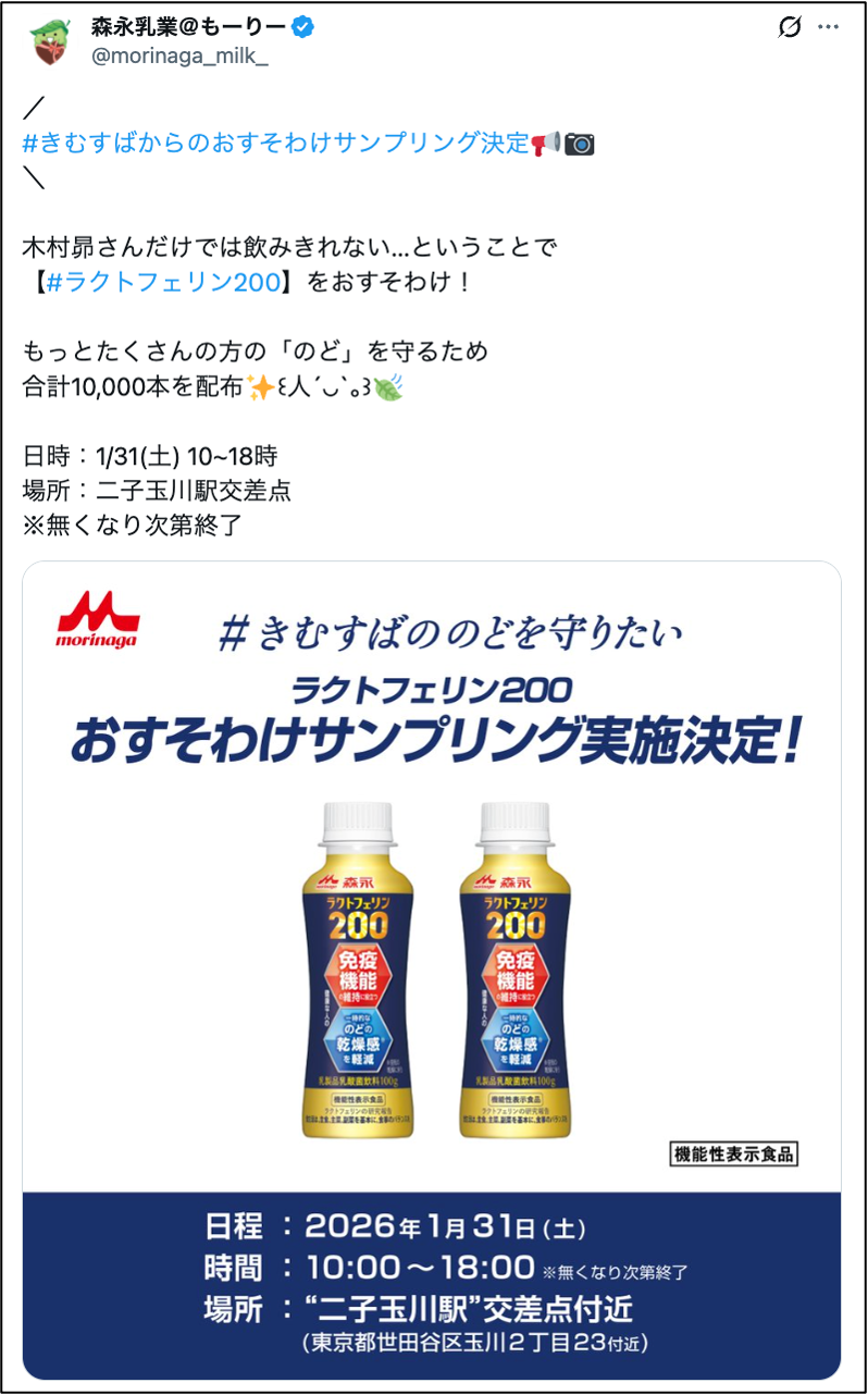 本施策は、X(旧Twitter)企画「#きむすばののどを守りたい」キャンペーンにおいて、木村昴さんへの差し入れが想定超の5,610本を突破したことを受け、木村さんご本人より「集まった差し入れを多くの人へおすそわけしたい」との発案があり決定したものです。当日は、木村昴さんの想いを形にした「森永ラクトフェリン200ドリンクタイプ」の“おすそわけ”を行います。