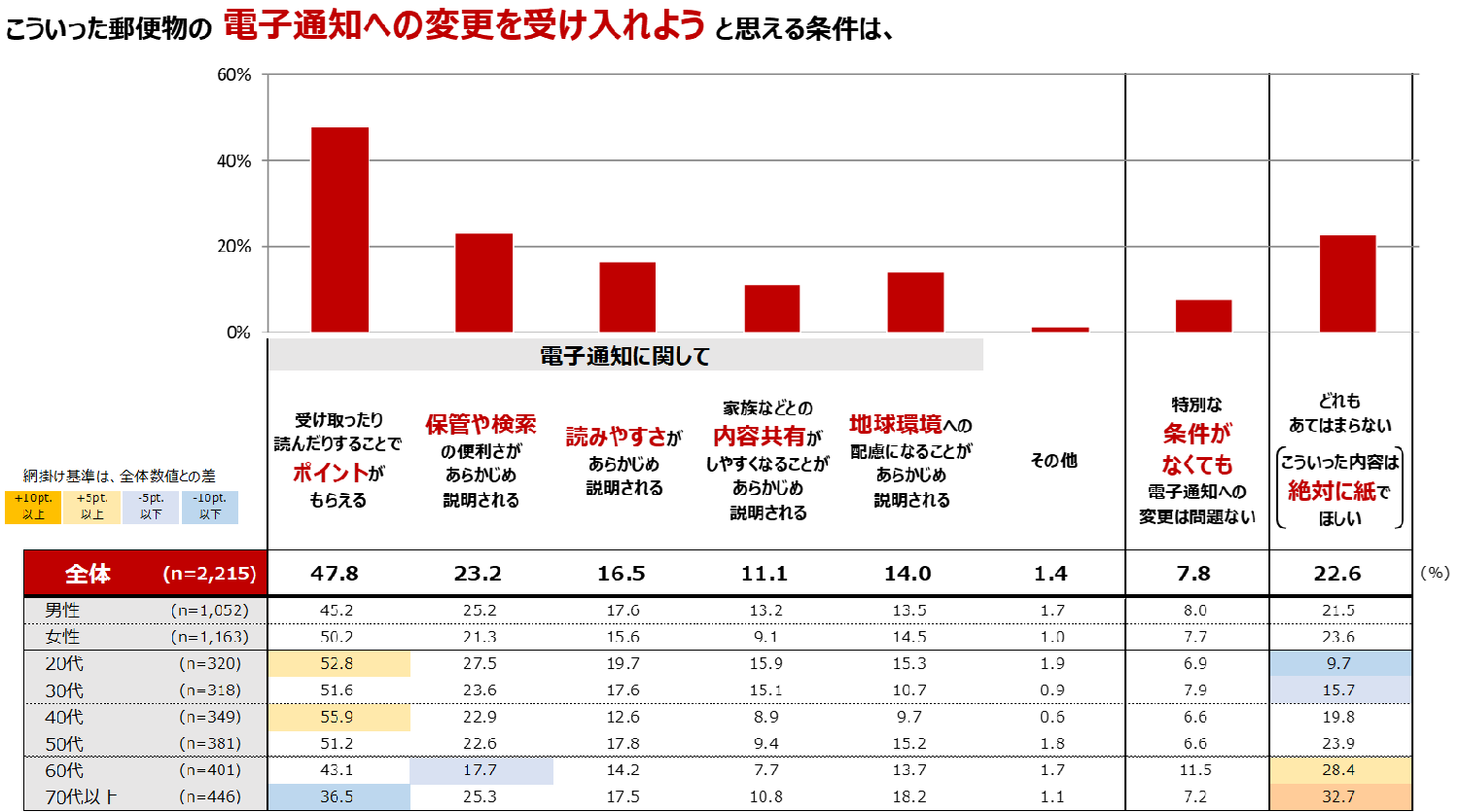 銀行や保険会社からの通知物は「必ず紙の郵便で」の回答が多数「ポイントの付与」や「保管・検索の利便性」が電子化許容の条件に