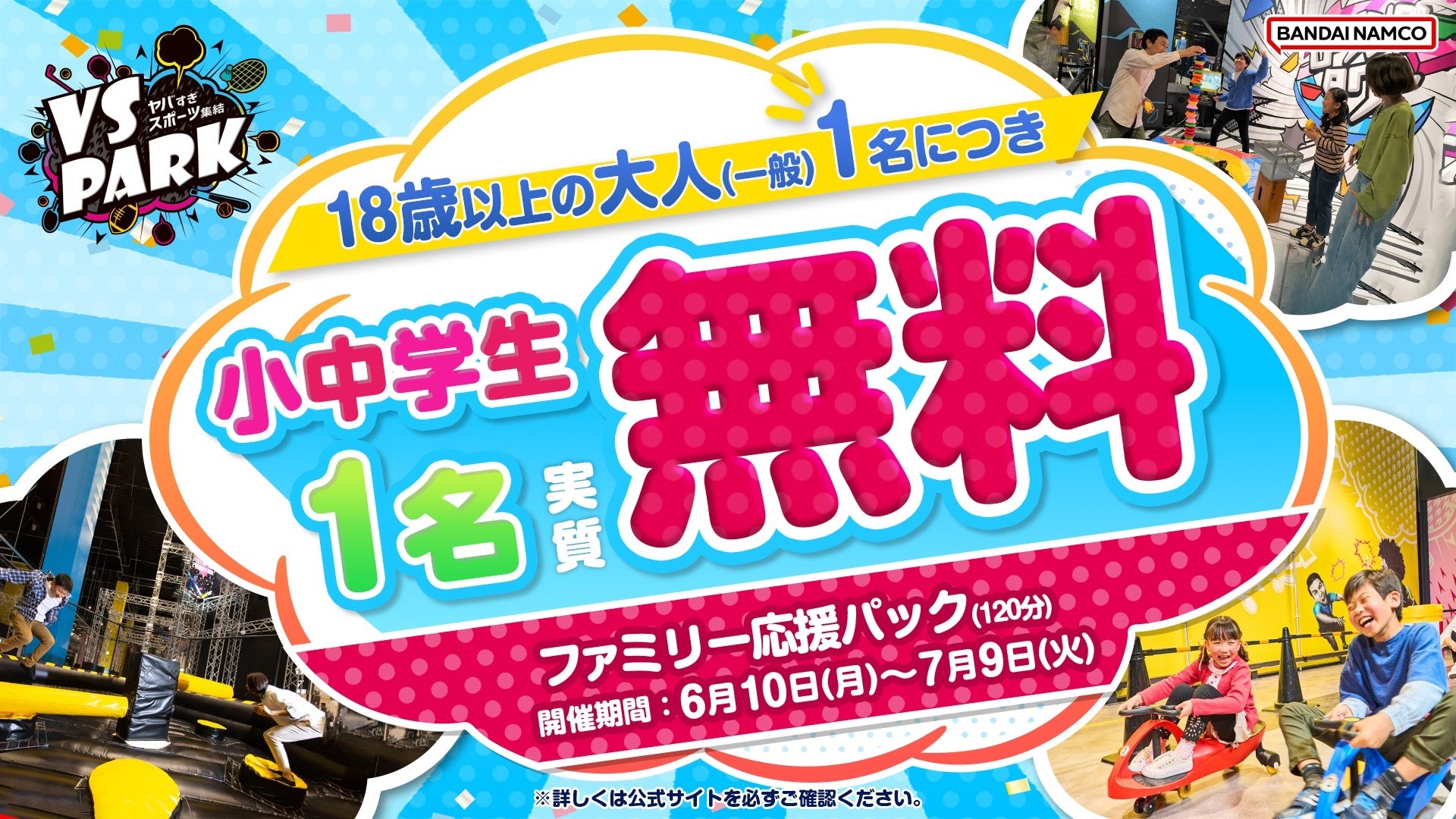 大人1名につき小中学生1名が実質無料! 期間限定で「ファミリー応援パック」を販売! 6月10日(月)より全国のVS PARKにて