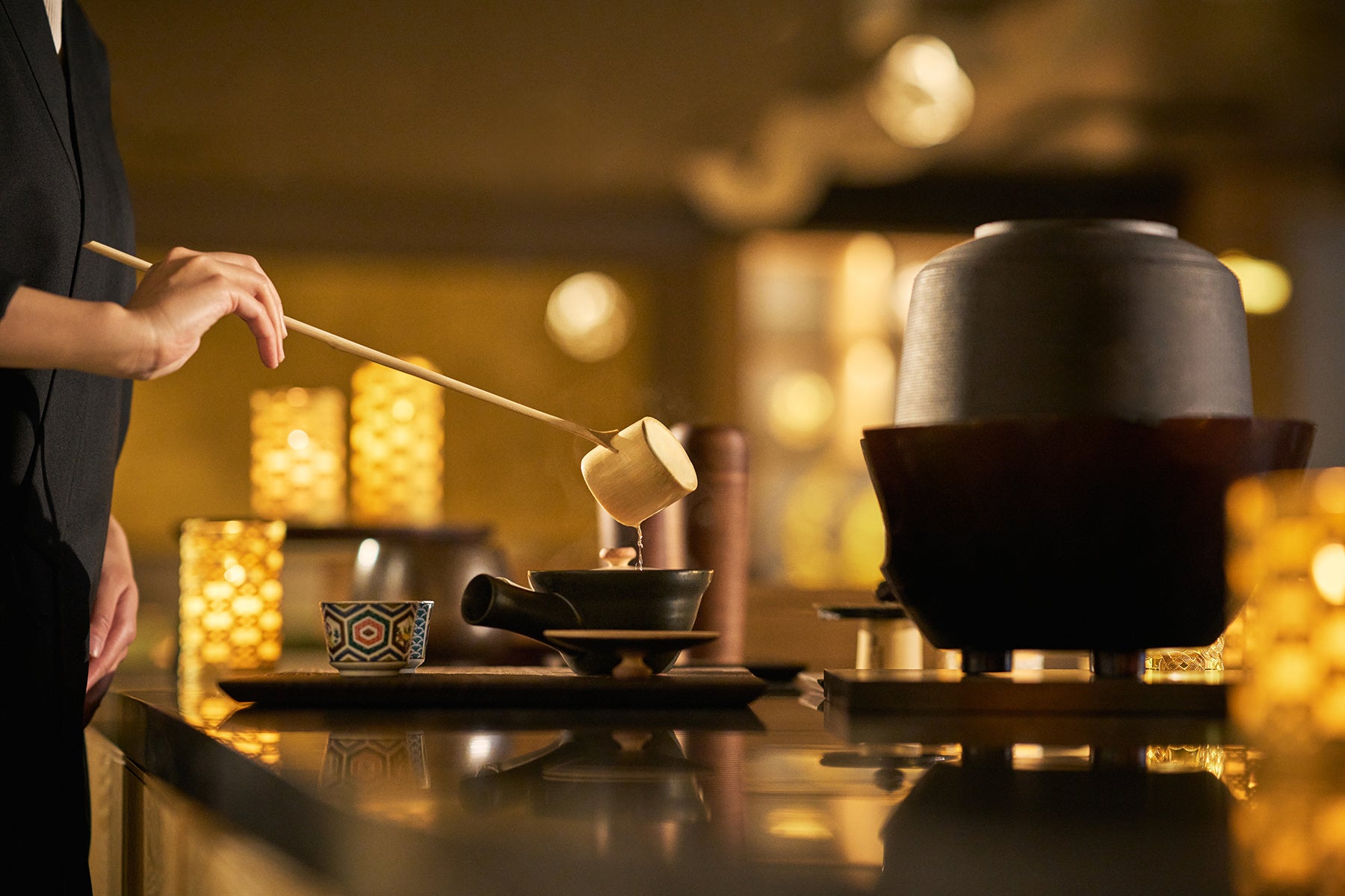「あっぱれ!味のかたまち」をコンセプトに、金沢での旅を味わい尽くす「街ナカ」ホテル「OMO5金沢片町(おも) by 星野リゾート」では、2025年4月22日から通年で、石川・金沢の伝統工芸が彩る空間で加賀棒茶(*1)を愉しむ「金沢KOGEIナイトサロン」を開催します。夜の時間帯に、「金沢箔」や「加賀水引細工」など石川・金沢の伝統工芸を用いた空間で、ホテルスタッフが目の前で淹れたお茶を金沢の茶菓子とともに味わえる、宿泊者限定のコンテンツです。加賀棒茶の歴史や茶店ごとのこだわりを聞きながら、特徴の異なる2種類のお茶を飲み比べ、色や香り、味の違いを愉しめます。また、茶器にも伝統工芸を用いており、実際に使ってその魅力を体験できます。