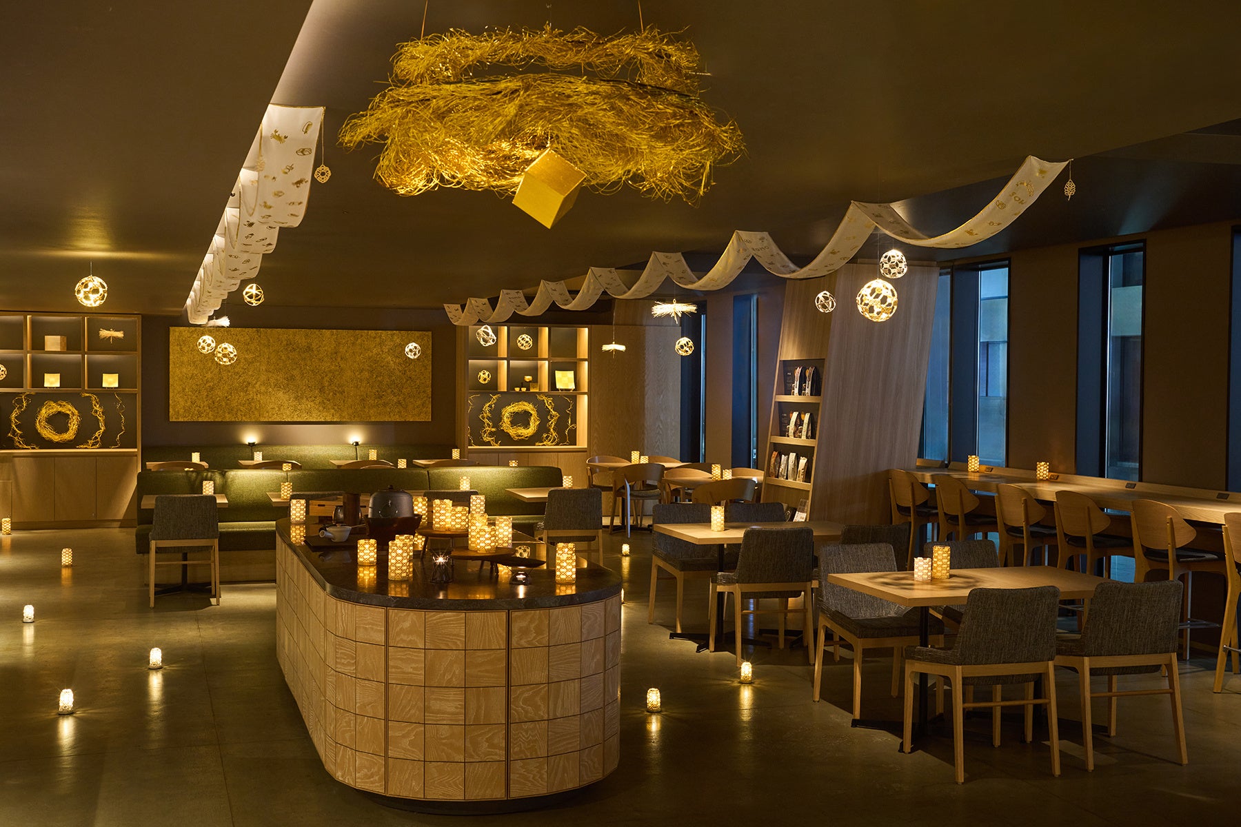 空間装飾は、金沢箔や加賀水引細工などの伝統工芸を用いて、各職人の高い技術を発揮して製作しました。日本独特の美意識「わびさび」をベースに、各工芸それぞれの素材感とアート性を感じるデザインで表現しています。また、茶器には「九谷焼」や「輪島塗」、「桐工芸」など、お茶と金沢の茶菓子を愉しむのにぴったりな伝統工芸を集めました。間近で見たり、実際に使ったりすることで、各工芸の魅力や、職人の繊細な技術を体感できます。夜のひとときを演出するひとつひとつの要素を通して、伝統工芸の魅力をお客様に感じていただきたいと考えています。