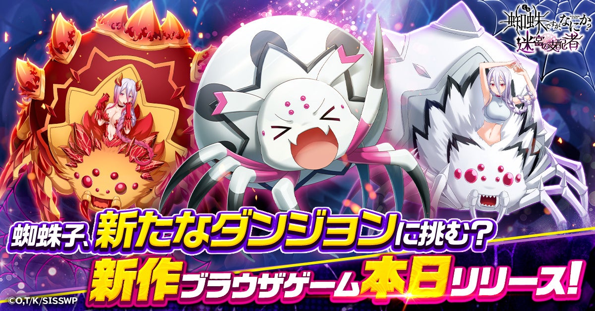 ゲームサービスG123にて、「蜘蛛ですが、なにか? 迷宮の支配者」が本日正式にサービスを開始しました。「蜘蛛ですが、なにか? 」初のゲーム化作品である本作では、蜘蛛に転生してしまった「私」を育成して、仲間と共にダンジョンの中で格上モンスターと戦いながら、アニメの世界観をブラウザ上でお手軽にお楽しみいただけます。