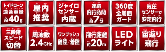 またドローン本体のガード部のLEDが発光し視認性を上げると共にカッコよさも演出、3段階のスピード切り替え、飛行距離が約20mなど、初心者だけでなく、これまでトイドローンで遊んだことのある方々にも満足いただける仕様となっています。