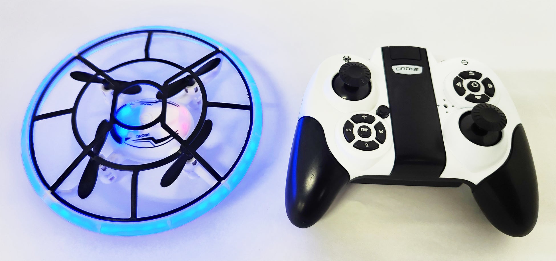 ドローン本体のリング状になった全周囲ガードにはLEDが内蔵されており、日中でもくっきり視認できるくらいの明るいブルーに発光します(発光はコントローラーのボタンでオン・オフの切り替えが可能)。