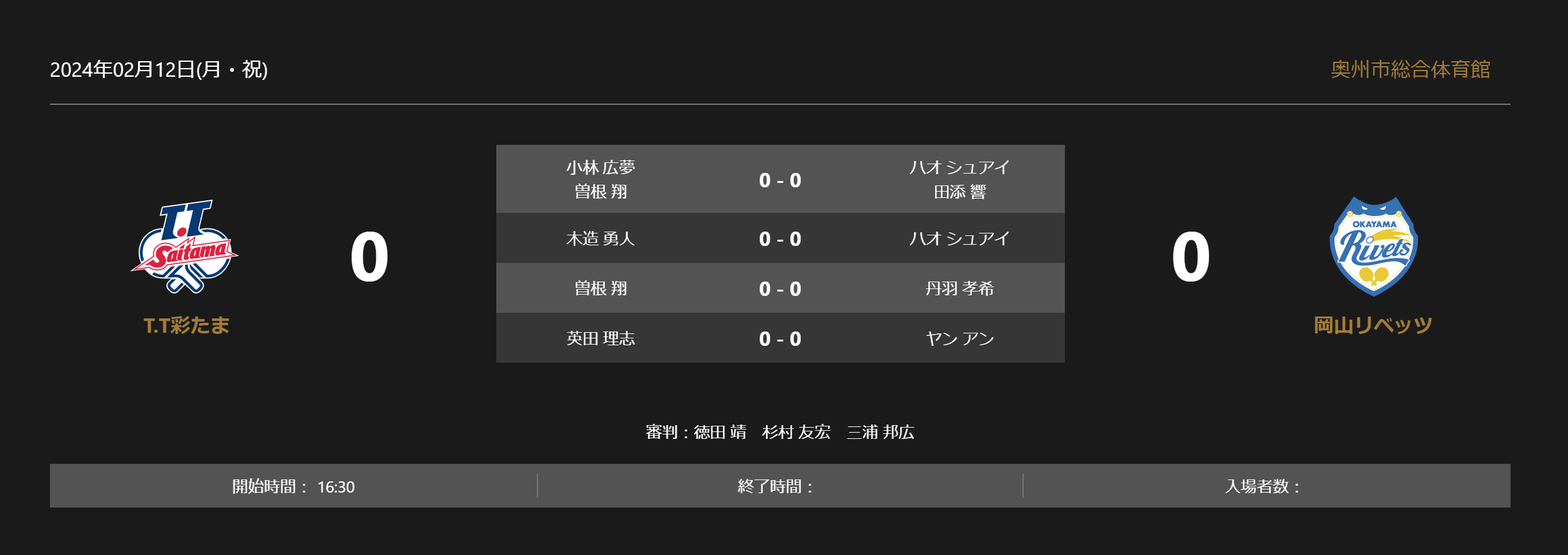 ノジマTリーグ 2023-2024シーズン 公式戦 2月12日開催 T.T彩たま vs 岡山リベッツ 対戦オーダー発表