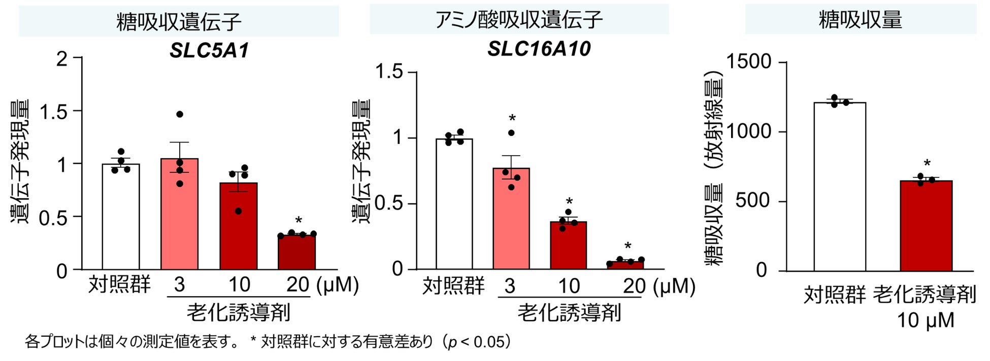 正常なヒト小腸オルガノイドと、細胞老化モデルヒト小腸オルガノイドにおいて、栄養素吸収に関わる遺伝子発現量を比較しました。細胞老化の誘導により、糖の吸収に関わる遺伝子であるSLC5A1、アミノ酸の吸収に関わる遺伝子であるSLC16A10の発現量が減少していることが明らかになりました。さらに、細胞老化モデルにおいて、細胞内への糖吸収量が減少していることが明らかになりました(図1)。