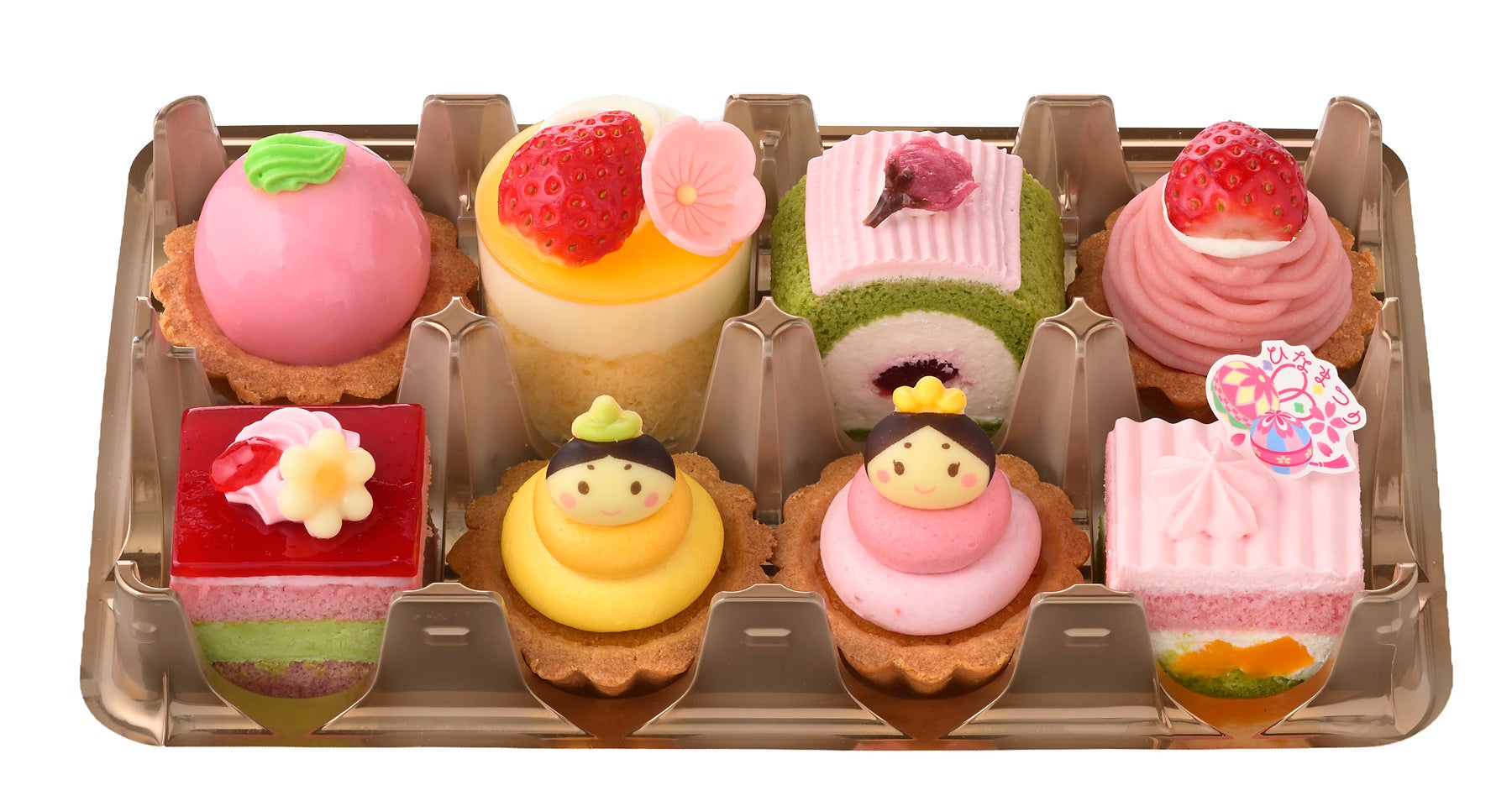 おだいりさまとおひなさまをイメージしたプチケーキアソート「ひなパーティー(8個入)」をはじめ、“ひなまつりカラー”で仕上げた縁起のいい扇形のデコレーションケーキ「ひなおうぎ」、プチデコレーションケーキのペアセットなど、全7種類。ご家族やご友人とのパーティーなど、さまざまなお祝いシーンに合わせて、お選びいただけるラインアップです。