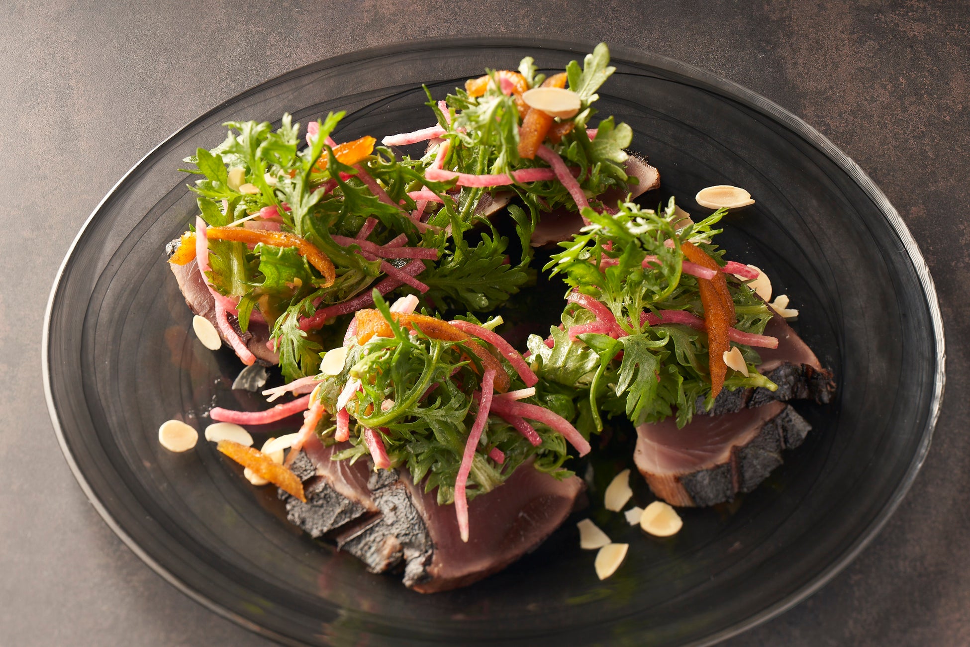 春菊と紅心大根のメランジェ 干し柿のヴィネグレット