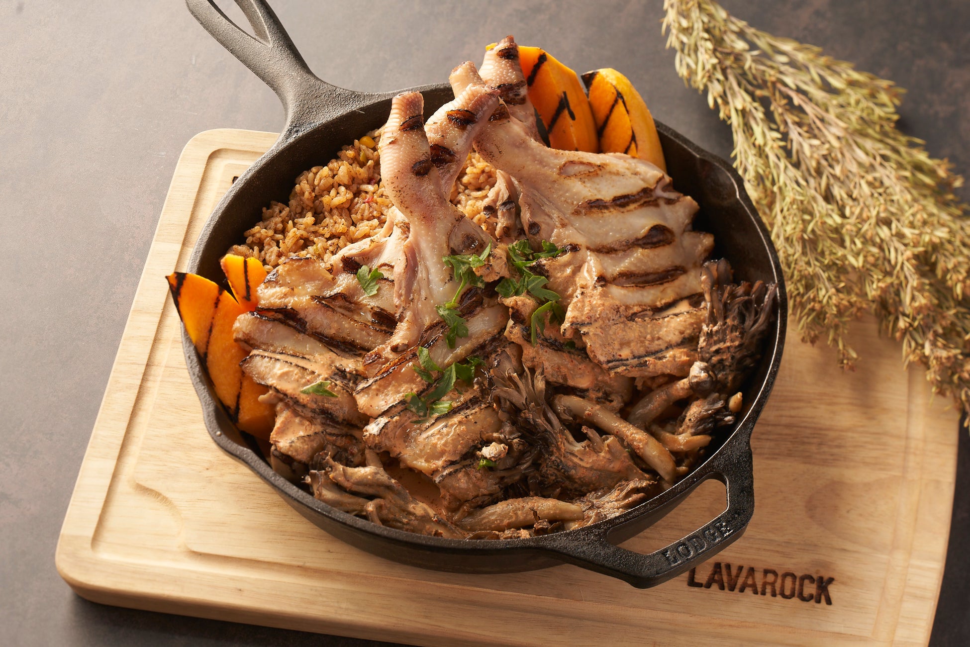 鮮やかな紅心大根をあしらった前菜は、脂をたたえた秋の味覚・戻り鰹の焼き霜グリル。干し柿の深い甘みのソースをまとわせ、アクセントにほろ苦い春菊を添えた、季節を感じる一皿です。魚料理は、シェフが厳選した旬魚の照り焼きを焼きナスと合わせ、トマト煮込みで。柚子胡椒を加えたタップナードソースが、和のエッセンスを感じさせます。肉料理はLAVAROCK自慢のBBQグリル。大振りで食べ応えのある骨付き「日南鶏」のグリルに、おこげが香ばしいジャンバラヤと、きのこたっぷりのスパイシーなソースを添えました。ジューシーなチキンと共にスパイシーなジャンバラヤを頬張る、食欲の秋のパーティータイムを演出する逸品です。