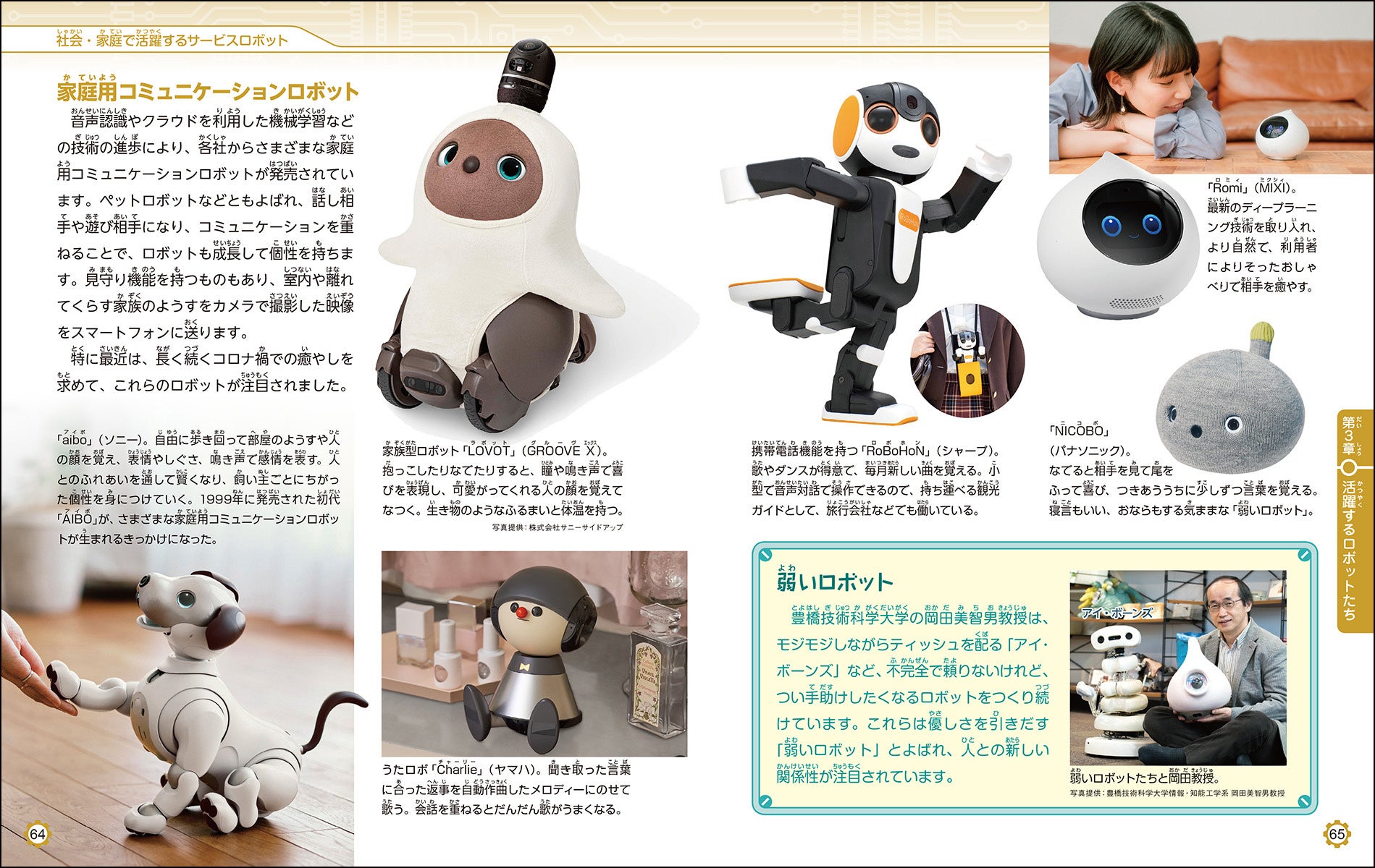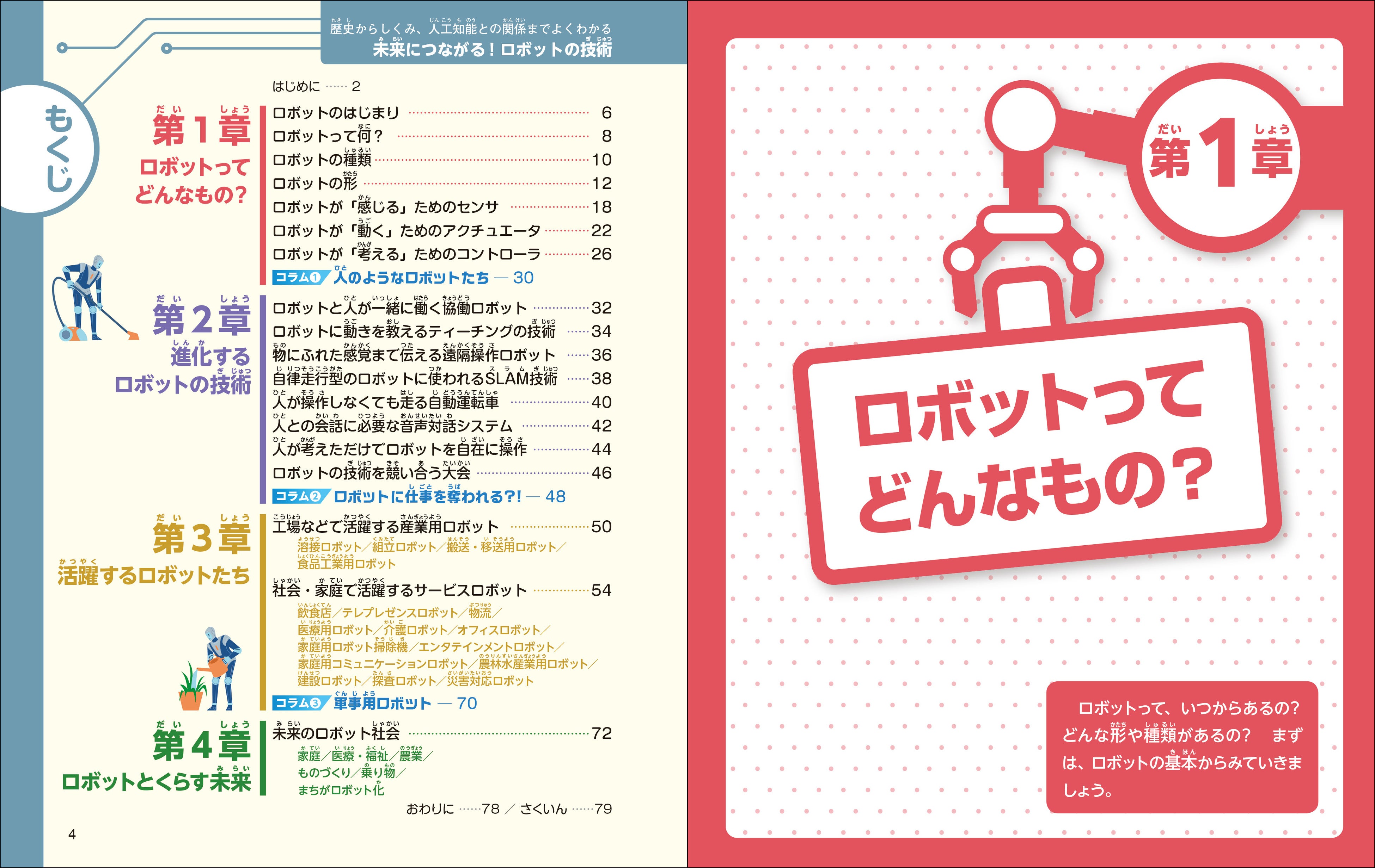 どういった種類のロボットがどんなところで働いているのか、産業用ロボット、サービスロボットとはなにか? など、一般的なロボットの知識を網羅。そしてロボット技術の発展によって、未来はどうなる? といった点まで、順序だててわかりやすく解説します。
