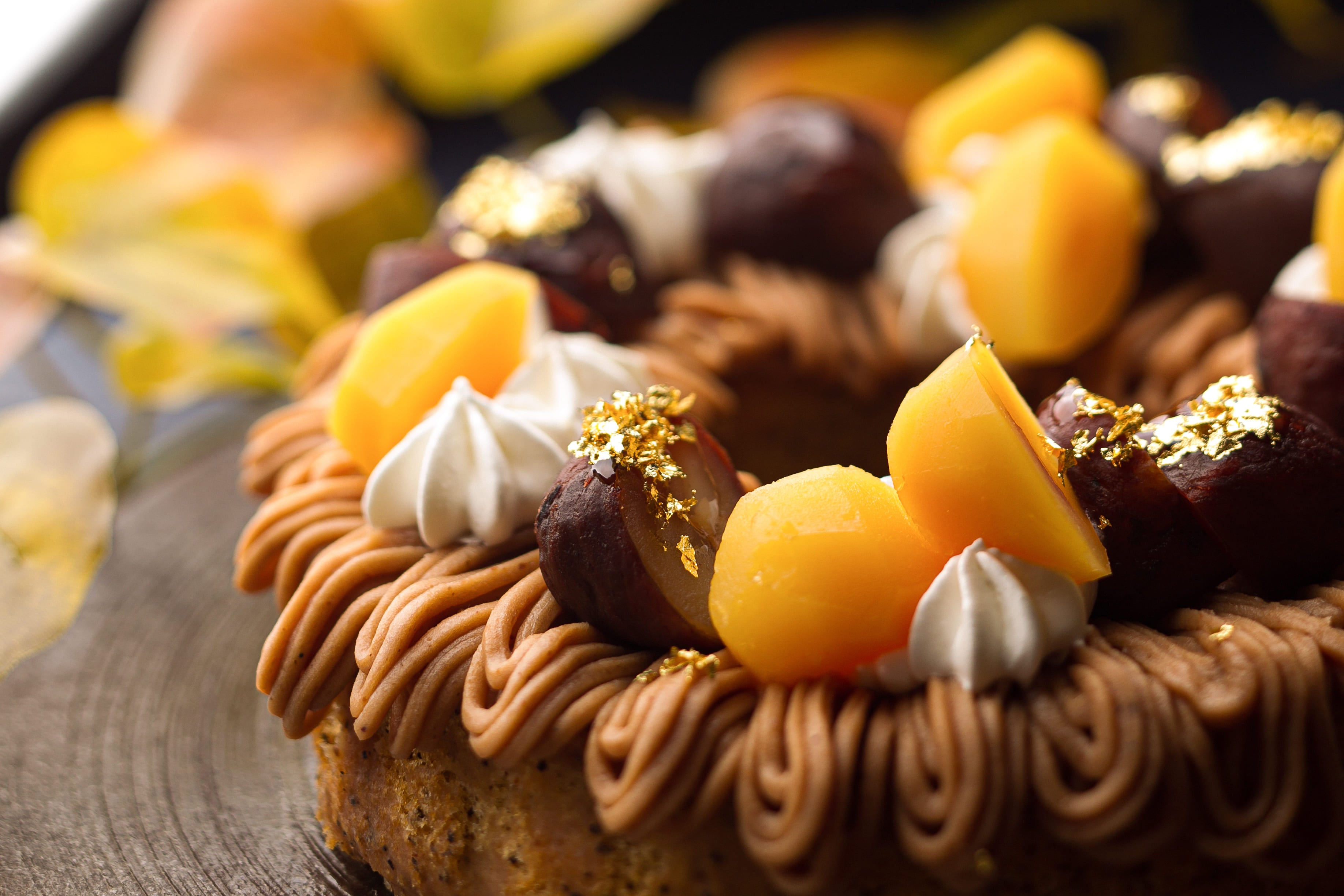 左上)ふんわり焼き上げたくちどけ良いシフォンケーキにイタリア産マロンクリームを絞った「栗シフォン」