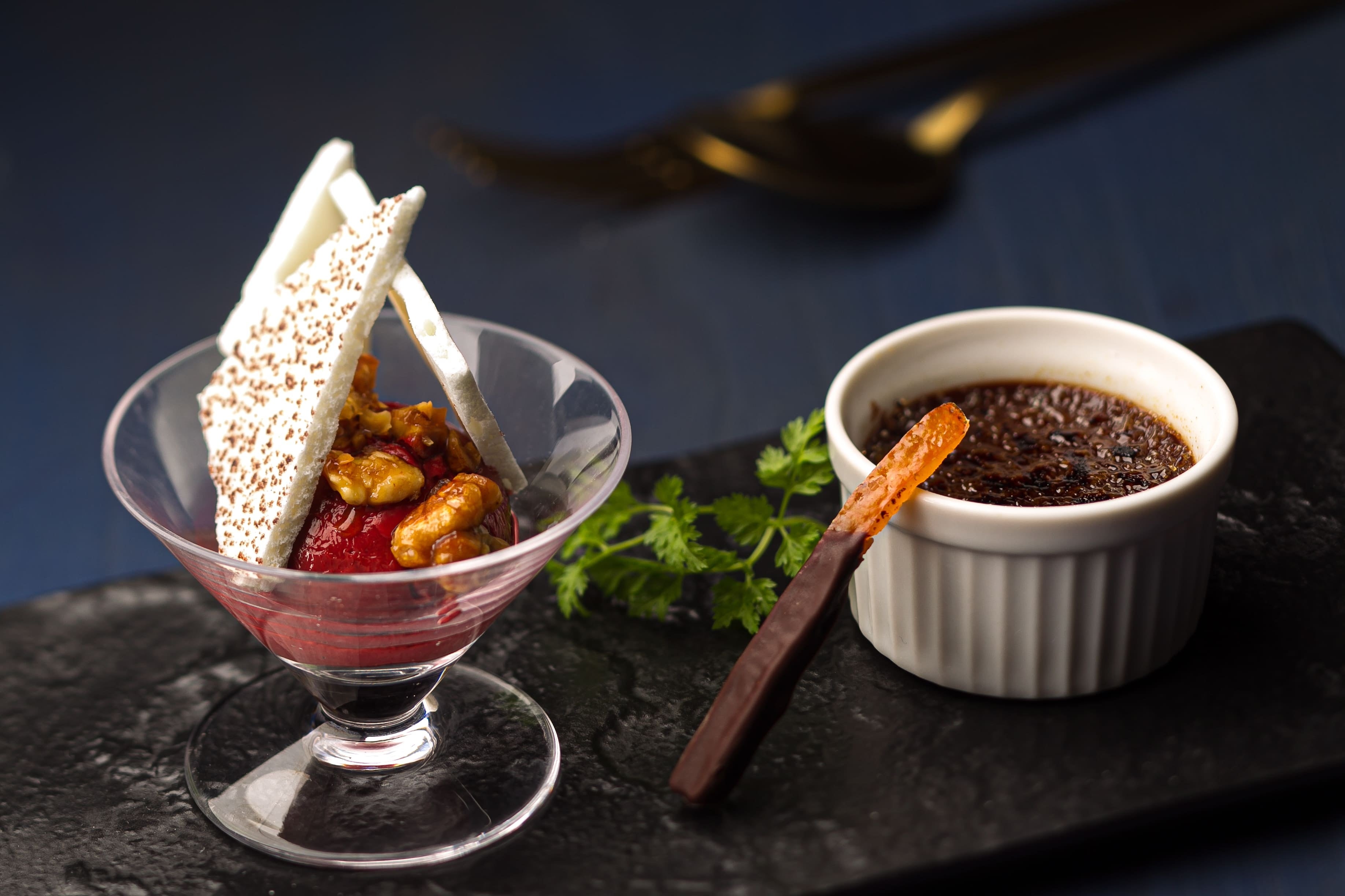 左下)スペシャルデザート「赤ブドウのバシュランアイスとチョコブリュレ オランジェットを添えて」